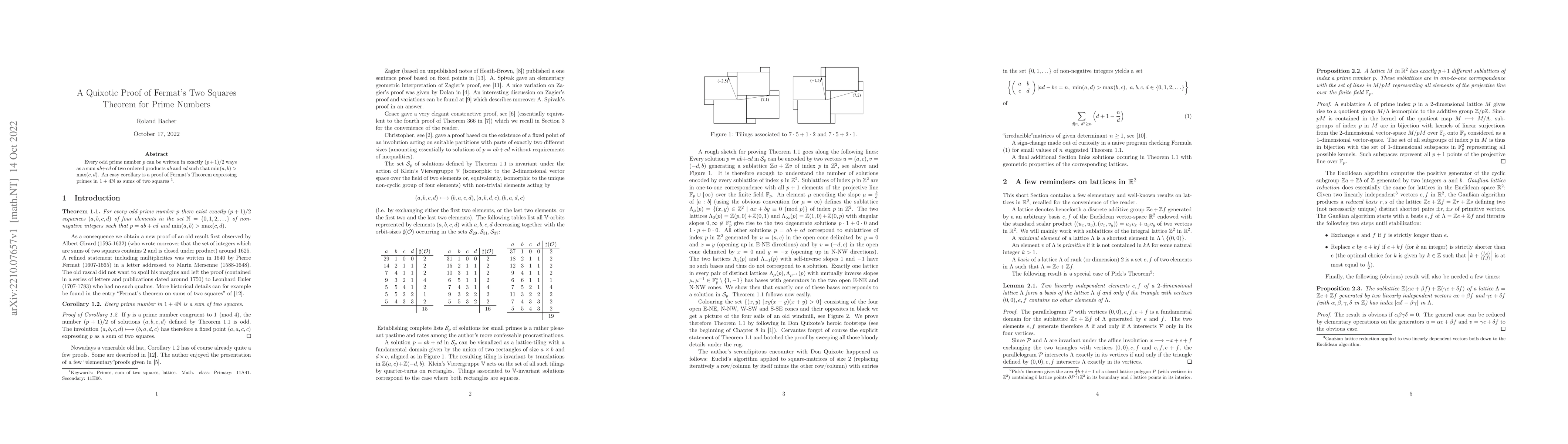 Every odd prime number p can be written in exactly (p + 1)/2 ways as a sum ab+cd of two ordered products ab and cd such that min(a, b) > max(c, d). An easy corollary is a proof of Fermat's Theorem expressing primes in 1 + 4N as sums of two squares.
