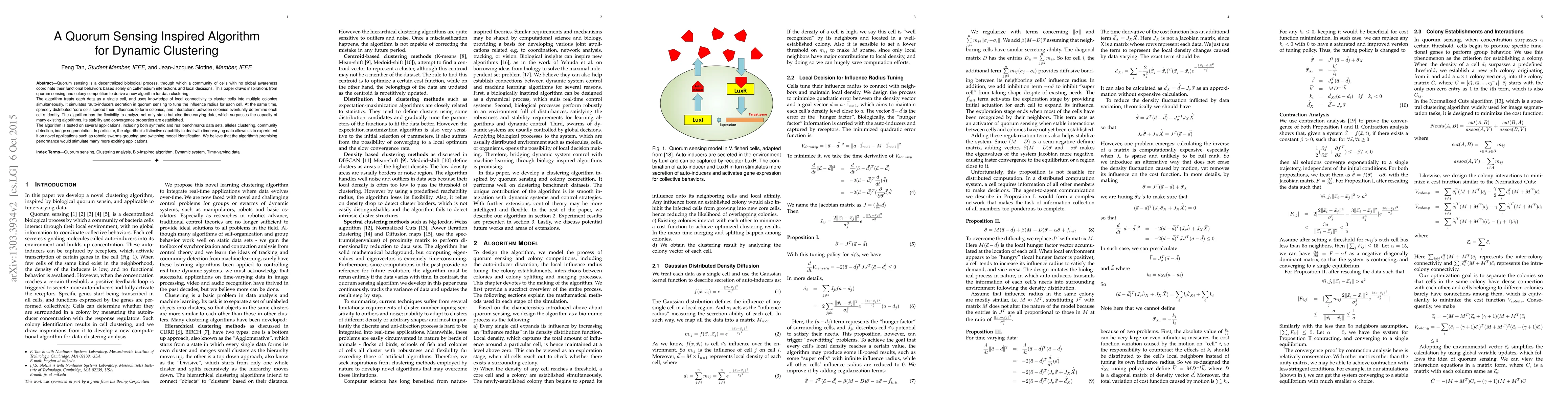 Quorum sensing is a decentralized biological process, through which a community of cells with no global awareness coordinate their functional behaviors based solely on cell-medium interactions and local decisions. This paper draws inspirations from quorum sensing and colony competition to derive a new algorithm for data clustering. The algorithm treats each data as a single cell, and uses knowledge of local connectivity to cluster cells into multiple colonies simultaneously. It simulates auto-inducers secretion in quorum sensing to tune the influence radius for each cell. At the same time, sparsely distributed core cells spread their influences to form colonies, and interactions between colonies eventually determine each cell's identity. The algorithm has the flexibility to analyze not only static but also time-varying data, which surpasses the capacity of many existing algorithms. Its stability and convergence properties are established. The algorithm is tested on several applications, including both synthetic and real benchmarks data sets, alleles clustering, community detection, image segmentation. In particular, the algorithm's distinctive capability to deal with time-varying data allows us to experiment it on novel applications such as robotic swarms grouping and switching model identification. We believe that the algorithm's promising performance would stimulate many more exciting applications.