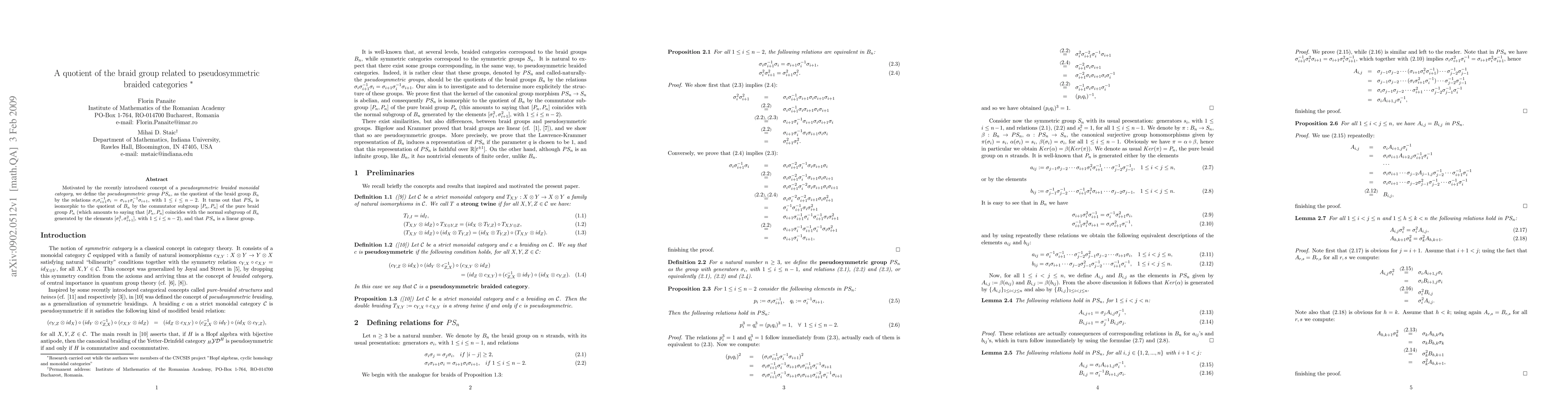 This paper introduces the pseudosymmetric group PS_n as the quotient of the braid group B_n by specific relations, and shows that PS_n is isomorphic to the quotient of B_n by the commutator subgroup of the pure braid group P_n, revealing PS_n as a linear group.