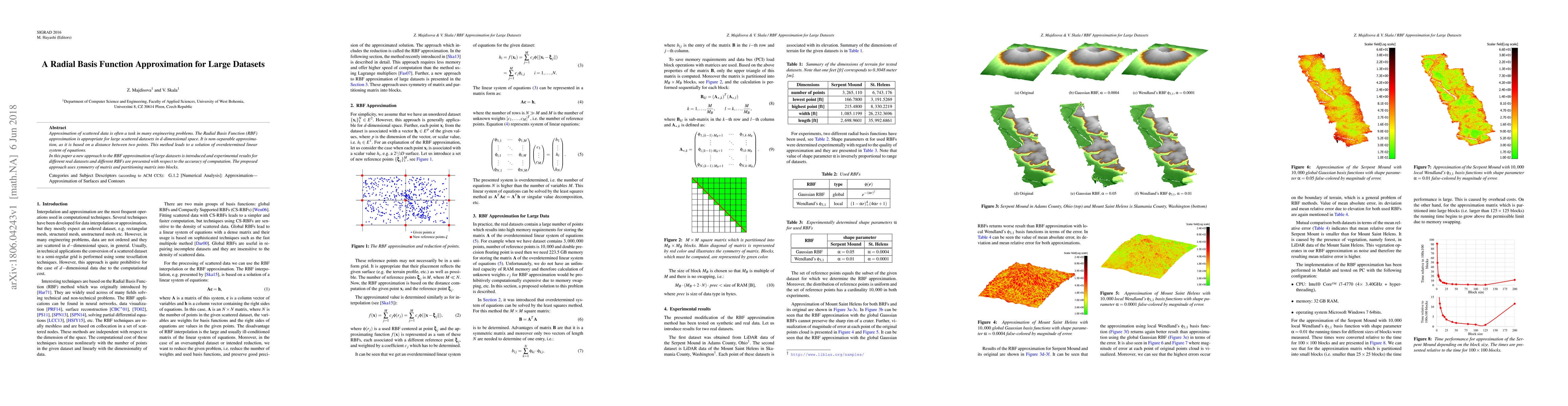 Approximation of scattered data is often a task in many engineering problems. The Radial Basis Function (RBF) approximation is appropriate for large scattered datasets in d-dimensional space. It is non-separable approximation, as it is based on a distance between two points. This method leads to a solution of overdetermined linear system of equations. In this paper a new approach to the RBF approximation of large datasets is introduced and experimental results for different real datasets and different RBFs are presented with respect to the accuracy of computation. The proposed approach uses symmetry of matrix and partitioning matrix into blocks.
