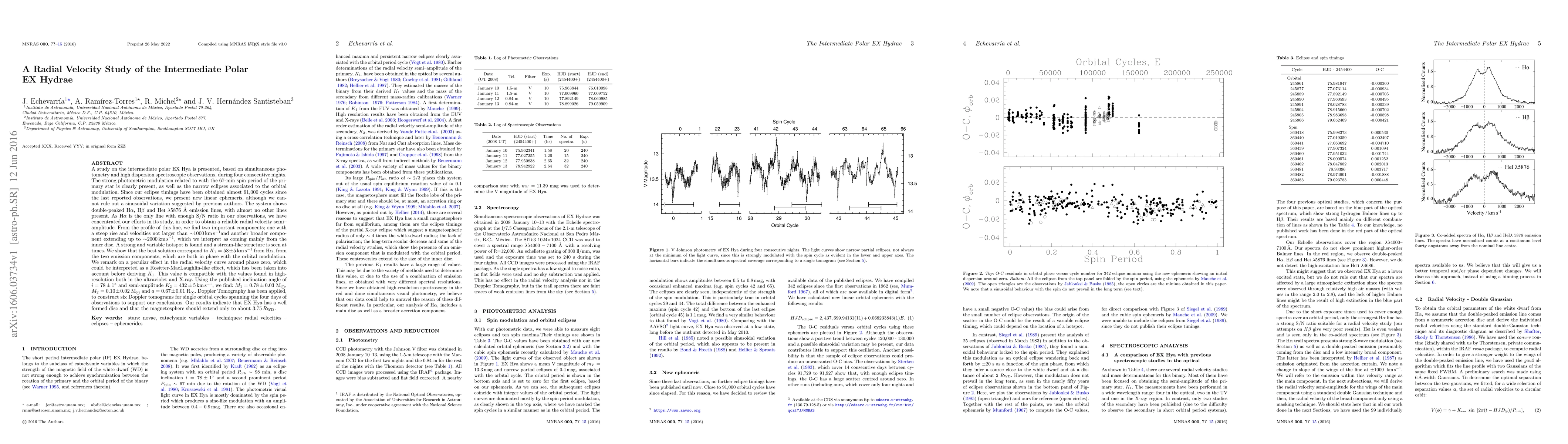 This study of the intermediate polar EX Hya reveals a strong spin period modulation and double-peaked emission lines, with radial velocities indicating a primary star mass of $0.78 \pm 0.03$ M$_{\odot}$ and a secondary mass of $0.10 \pm 0.02$ M$_{\odot}$, suggesting a well-formed disc and magnetosphere extending to $3.75\,R_{\rm{WD}}$.