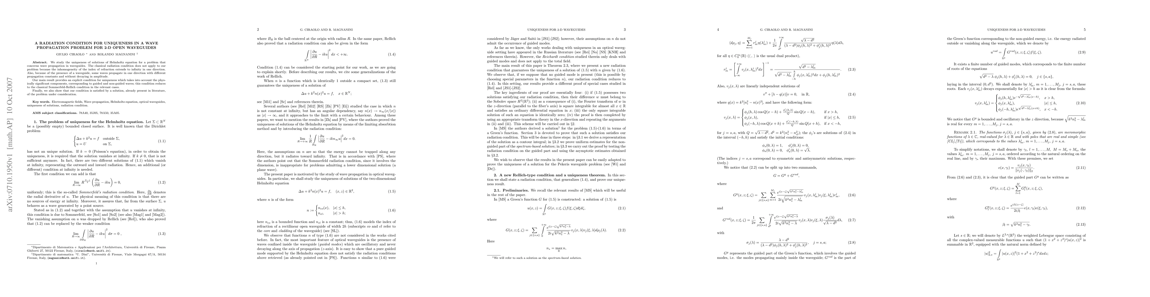 We study the uniqueness of solutions of Helmholtz equation for a problem that concerns wave propagation in waveguides. The classical radiation condition does not apply to our problem because the inhomogeneity of the index of refraction extends to infinity in one direction. Also, because of the presence of a waveguide, some waves propagate in one direction with different propagation constants and without decaying in amplitude. Our main result provides an explicit condition for uniqueness which takes into account the physically significant components, corresponding to guided and non-guided waves; this condition reduces to the classical Sommerfeld-Rellich condition in the relevant cases. Finally, we also show that our condition is satisfied by a solution, already present in literature, of the problem under consideration.