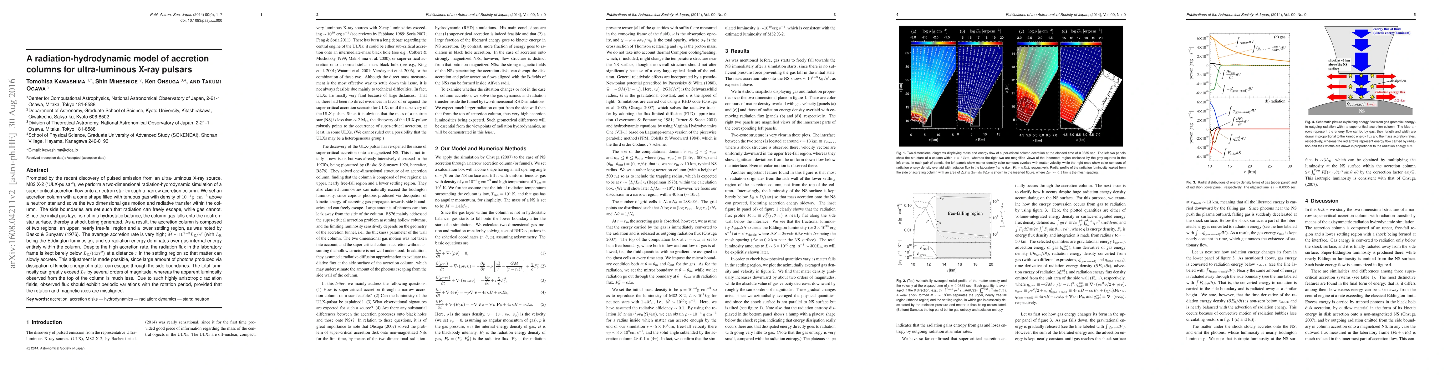 This paper presents a two-dimensional radiation-hydrodynamic simulation of a super-critical accretion column onto a neutron star, revealing the generation of shocks and the formation of distinct upper and lower regions. The model explains how radiation energy dominates, allowing high accretion rates while maintaining observed luminosity below the Eddington limit due to anisotropic radiation fields.