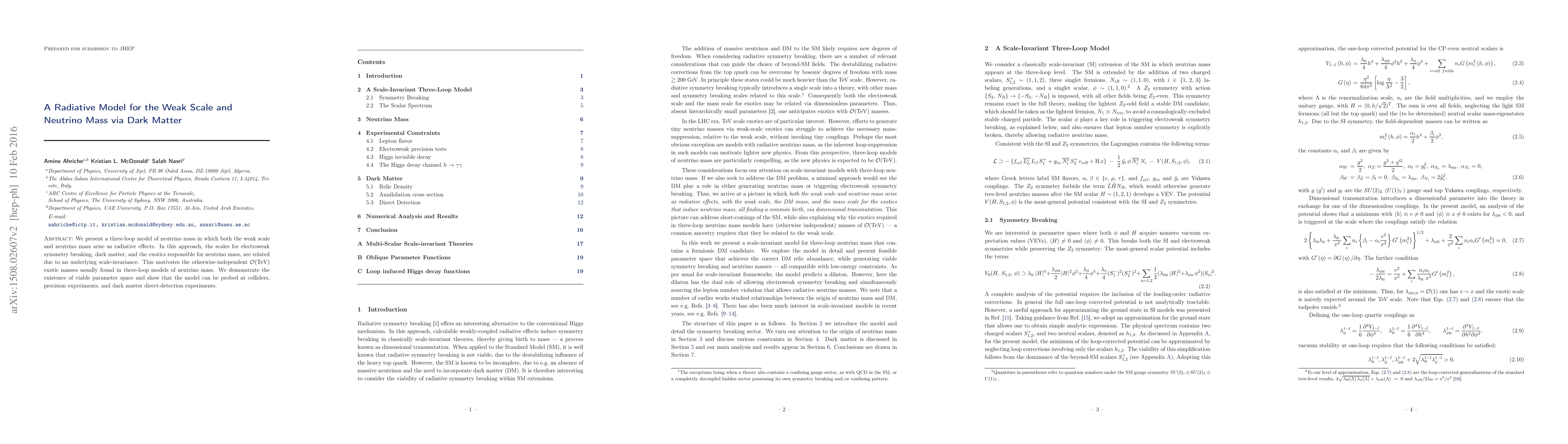 This paper proposes a three-loop radiative model linking the weak scale, neutrino mass, and dark matter through an underlying scale-invariance, demonstrating viable parameter space and potential collider and direct-detection testability.