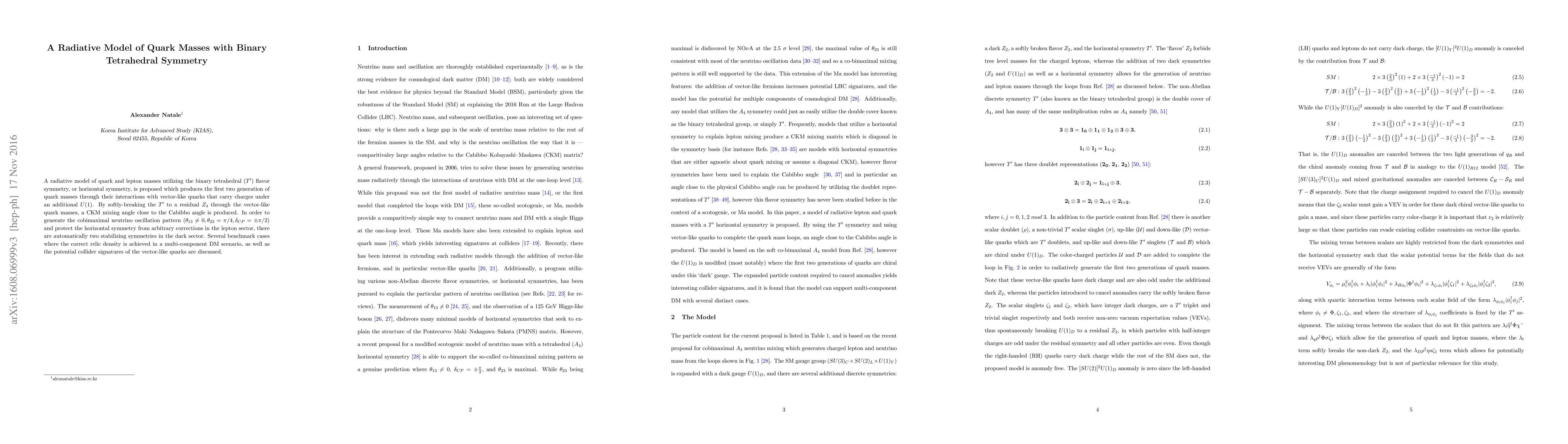 A radiative model of quark and lepton masses utilizing the binary tetrahedral ($T^{\prime}$) flavor symmetry, or horizontal symmetry, is proposed which produces the first two generation of quark masses through their interactions with vector-like quarks that carry charges under an additional $U(1)$. By softly-breaking the $T^{\prime}$ to a residual $Z_4$ through the vector-like quark masses, a CKM mixing angle close to the Cabibbo angle is produced. In order to generate the cobimaximal neutrino oscillation pattern ($\theta_{13}\neq0,\theta_{23}=\pi/4,\delta_{CP}=\pm \pi/2$) and protect the horizontal symmetry from arbitrary corrections in the lepton sector, there are automatically two stabilizing symmetries in the dark sector. Several benchmark cases where the correct relic density is achieved in a multi-component DM scenario, as well as the potential collider signatures of the vector-like quarks are discussed.