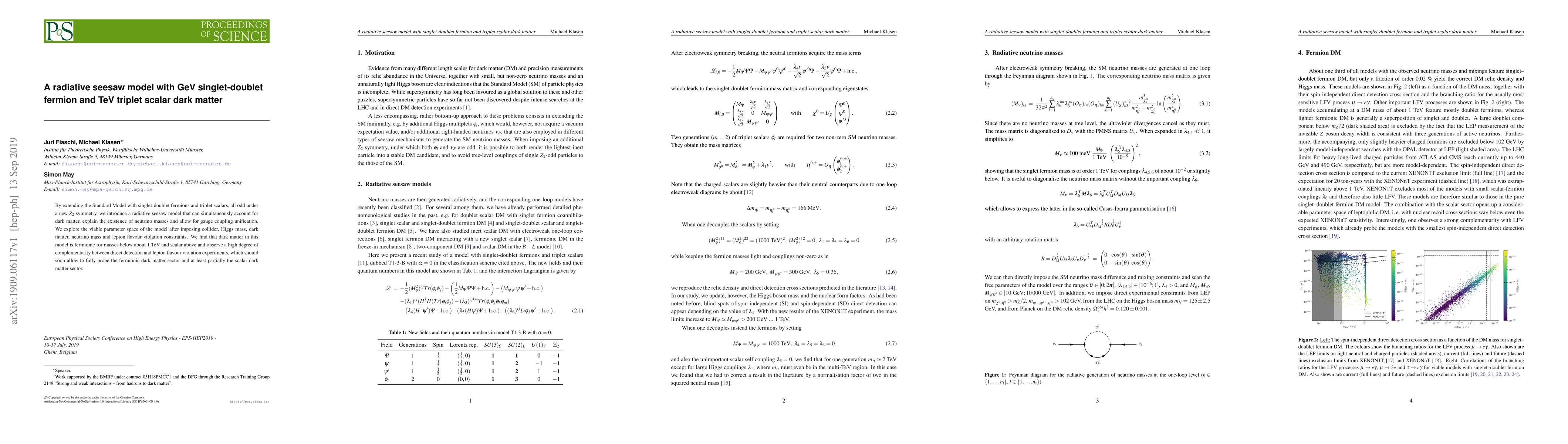 By extending the Standard Model with singlet-doublet fermions and triplet scalars, all odd under a new $Z_2$ symmetry, we introduce a radiative seesaw model that can simultaneously account for dark matter, explain the existence of neutrino masses and allow for gauge coupling unification. We explore the viable parameter space of the model after imposing collider, Higgs mass, dark matter, neutrino mass and lepton flavour violation constraints. We find that dark matter in this model is fermionic for masses below about 1 TeV and scalar above and observe a high degree of complementarity between direct detection and lepton flavour violation experiments, which should soon allow to fully probe the fermionic dark matter sector and at least partially the scalar dark matter sector.