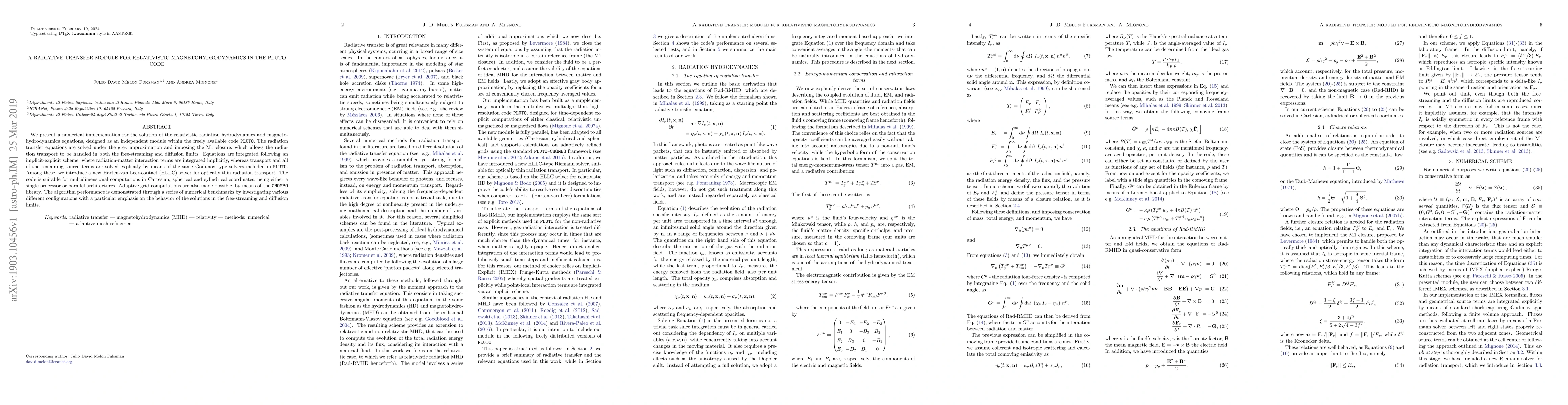 This paper introduces a new module for the PLUTO code that solves relativistic radiation hydrodynamics and magnetohydrodynamics equations, employing an implicit-explicit scheme and a new HLLC solver for optically thin radiation transport. The module supports multidimensional computations, adaptive grids, and parallel architectures, validated through numerical benchmarks.