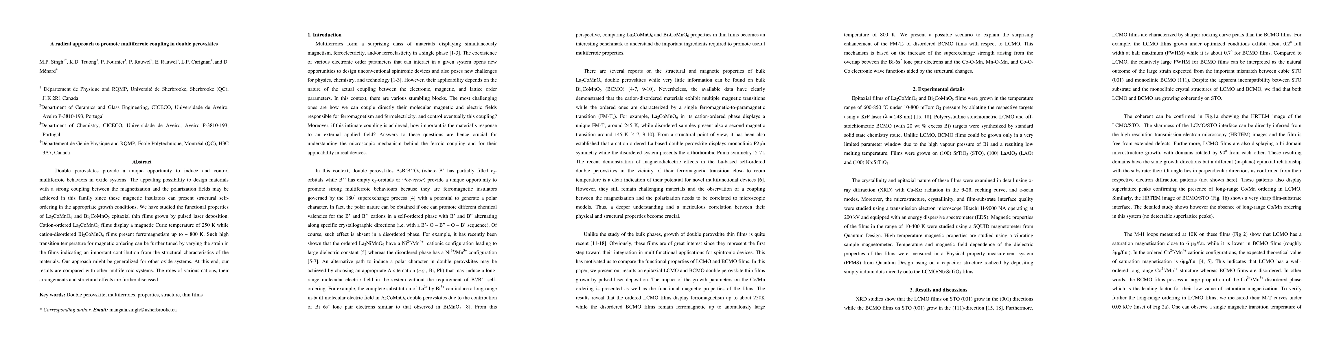 This paper investigates the multiferroic coupling in double perovskites La2CoMnO6 and Bi2CoMnO6 thin films, grown via pulsed laser deposition. The study finds that cation ordering in La2CoMnO6 leads to a Curie temperature of 250 K, while cation disorder in Bi2CoMnO6 supports ferromagnetism up to 800 K, highlighting the significant influence of structural characteristics on magnetic properties.