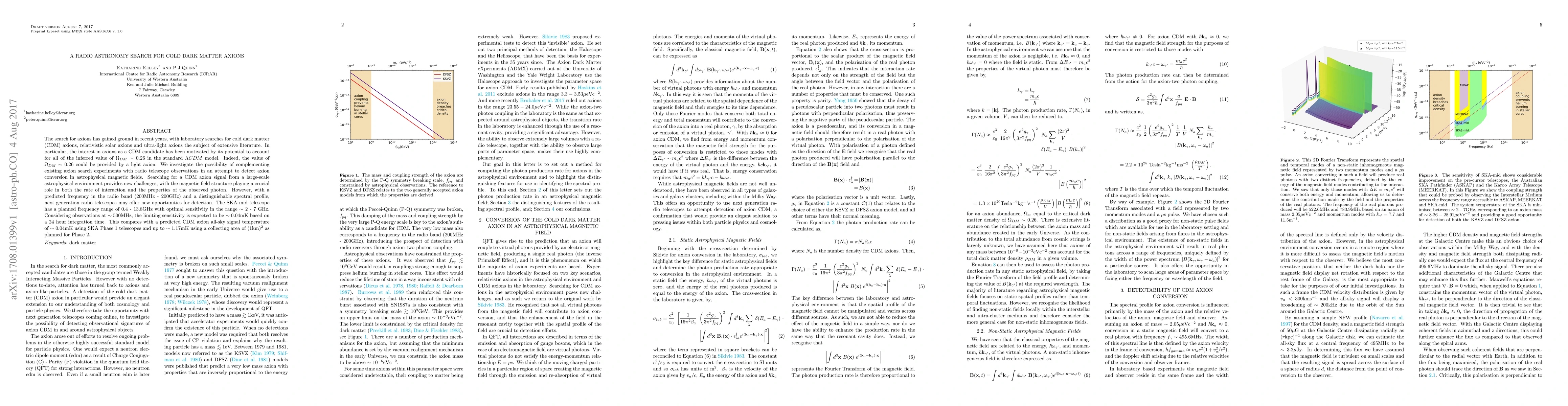This paper explores the potential of using radio telescope observations to detect axions, a candidate for cold dark matter, by investigating axion conversion in astrophysical magnetic fields. The study highlights the SKA-mid telescope's capability to detect axion signals with a predicted frequency in the radio band, offering new opportunities for detection.