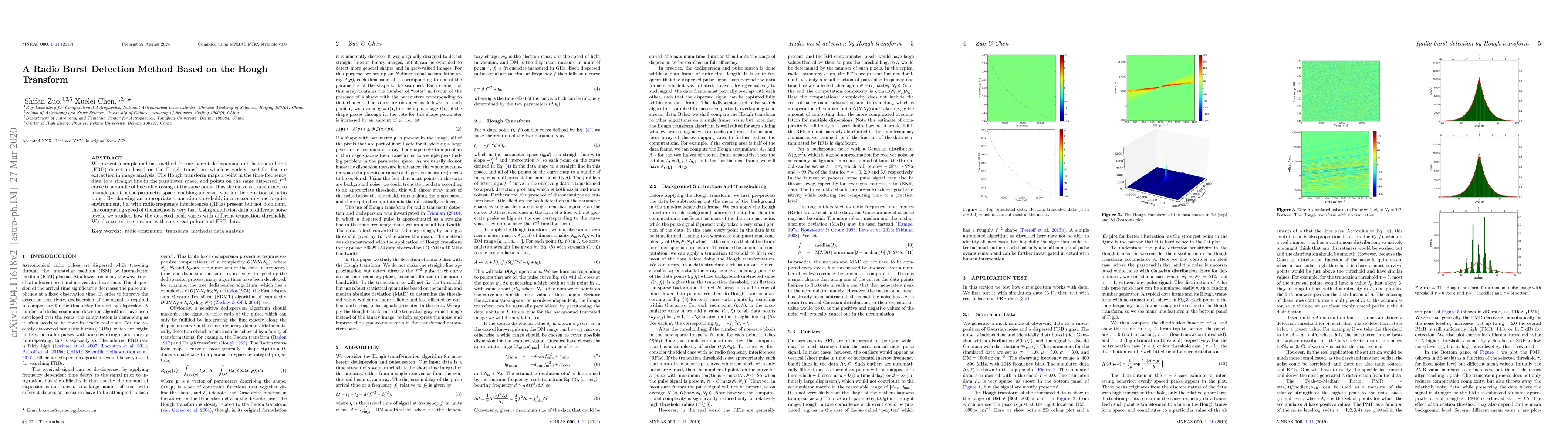 This paper introduces a fast radio burst detection method using the Hough transform for incoherent dedispersion, transforming dispersed curves into single points in parameter space for easier detection. The method's efficiency is demonstrated through simulations and real pulsar and FRB data, showing its effectiveness in radio quiet environments with minor radio frequency interferences.