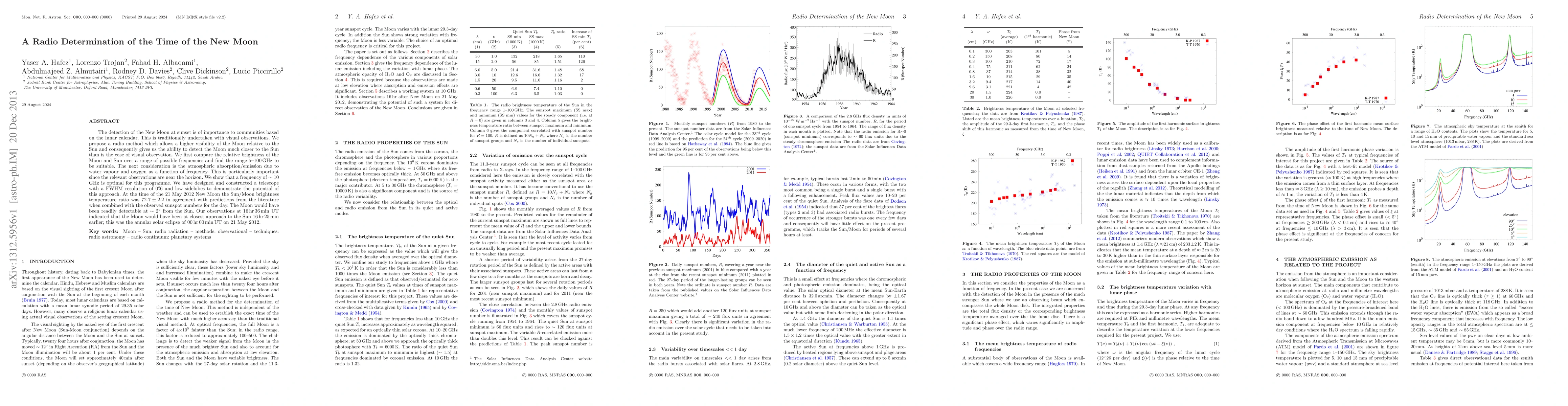 The detection of the New Moon at sunset is of importance to communities based on the lunar calendar. This is traditionally undertaken with visual observations. We propose a radio method which allows a higher visibility of the Moon relative to the Sun and consequently gives us the ability to detect the Moon much closer to the Sun than is the case of visual observation. We first compare the relative brightness of the Moon and Sun over a range of possible frequencies and find the range 5--100\,GHz to be suitable. The next consideration is the atmospheric absorption/emission due to water vapour and oxygen as a function of frequency. This is particularly important since the relevant observations are near the horizon. We show that a frequency of $\sim 10$ GHz is optimal for this programme. We have designed and constructed a telescope with a FWHM resolution of 0$^\circ{}\!\!$.6 and low sidelobes to demonstrate the potential of this approach. At the time of the 21 May 2012 New Moon the Sun/Moon brightness temperature ratio was $72.7 \pm 2.2$ in agreement with predictions from the literature when combined with the observed sunspot numbers for the day. The Moon would have been readily detectable at $\sim 2^{\circ}$ from the Sun. Our observations at 16\,hr\,36\,min UT indicated that the Moon would have been at closest approach to the Sun 16\,hr\,25\,min earlier; this was the annular solar eclipse of 00\,hr\,00\,min\,UT on 21 May 2012.