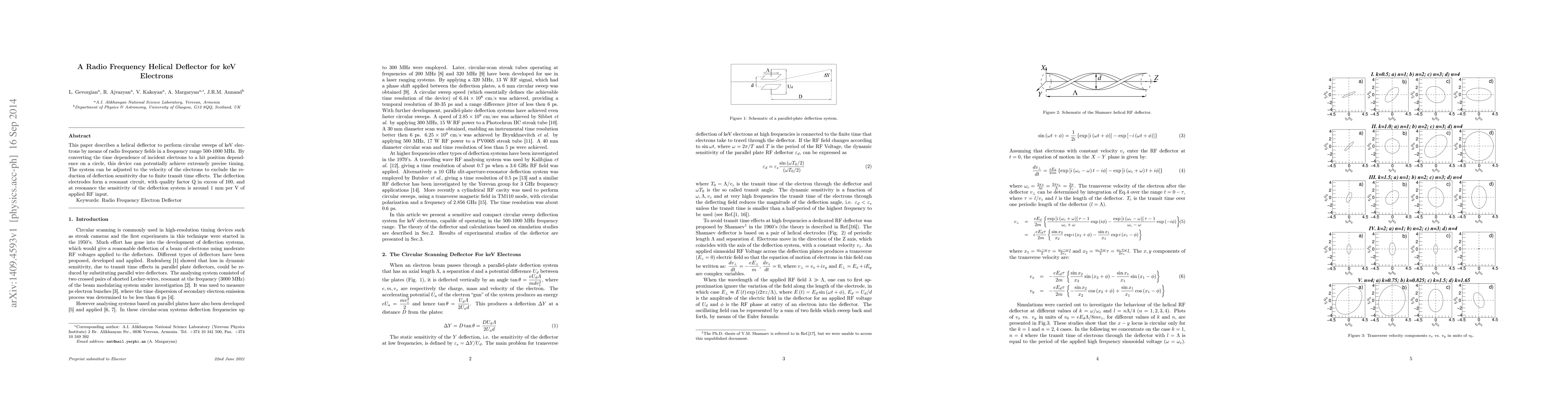 This paper describes a helical deflector to perform circular sweeps of keV electrons by means of radio frequency fields in a frequency range 500-1000 MHz. By converting the time dependence of incident electrons to a hit position dependence on a circle, this device can potentially achieve extremely precise timing. The system can be adjusted to the velocity of the electrons to exclude the reduction of deflection sensitivity due to finite transit time effects. The deflection electrodes form a resonant circuit, with quality factor Q in excess of 100, and at resonance the sensitivity of the deflection system is around 1~mm per V of applied RF input.