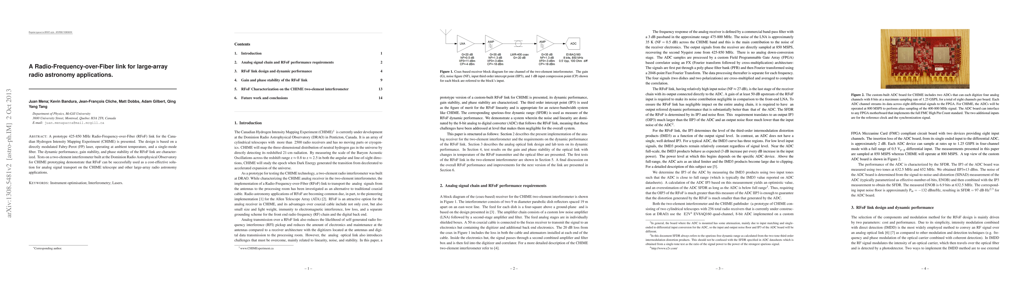This paper presents a prototype RFoF link operating between 425-850 MHz for the CHIME telescope, utilizing a directly modulated FP laser and single-mode fiber. The study demonstrates RFoF's potential as a cost-effective solution for transporting analog signals in large-array radio astronomy applications.