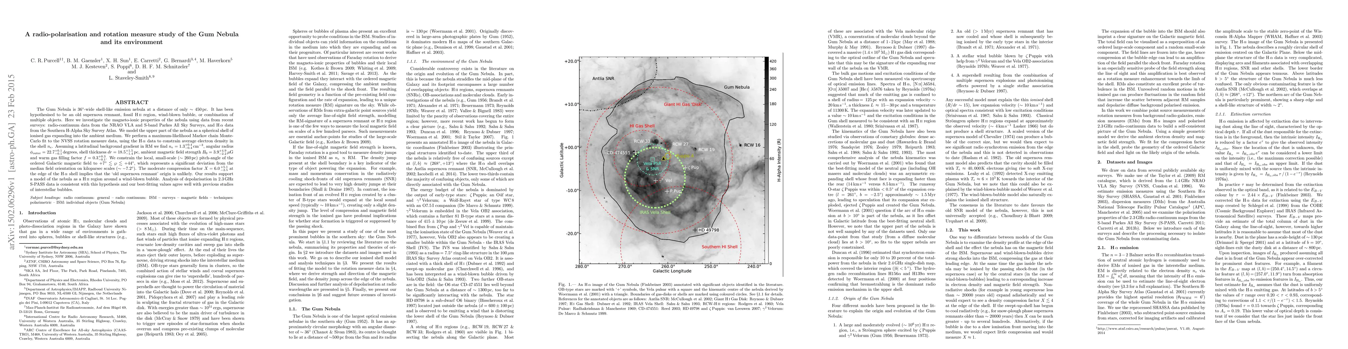 The Gum Nebula is 36 degree wide shell-like emission nebula at a distance of only 450 pc. It has been hypothesised to be an old supernova remnant, fossil HII region, wind-blown bubble, or combination of multiple objects. Here we investigate the magneto-ionic properties of the nebula using data from recent surveys: radio-continuum data from the NRAO VLA and S-band Parkes All Sky Surveys, and H-alpha data from the Southern H-Alpha Sky Survey Atlas. We model the upper part of the nebula as a spherical shell of ionised gas expanding into the ambient medium. We perform a maximum-likelihood Markov chain Monte-Carlo fit to the NVSS rotation measure data, using the H-halpha data to constrain average electron density in the shell $n_e$. Assuming a latitudinal background gradient in RM we find $n_e=1.3^{+0.4}_{-0.4} {\rm cm}^{-3}$, angular radius $\phi_{\rm outer}=22.7^{+0.1}_{-0.1} {\rm deg}$, shell thickness $dr=18.5^{+1.5}_{-1.4} {\rm pc}$, ambient magnetic field strength $B_0=3.9^{+4.9}_{-2.2} \mu{\rm G}$ and warm gas filling factor $f=0.3^{+0.3}_{-0.1}$. We constrain the local, small-scale (~260 pc) pitch-angle of the ordered Galactic magnetic field to $+7^{\circ}\lesssim\wp\lesssim+44^{\circ}$, which represents a significant deviation from the median field orientation on kiloparsec scales (~-7.2$^{\circ}$). The moderate compression factor $X=6.0\,^{+5.1}_{-2.5}$ at the edge of the H-alpha shell implies that the 'old supernova remnant' origin is unlikely. Our results support a model of the nebula as a HII region around a wind-blown bubble. Analysis of depolarisation in 2.3 GHz S-PASS data is consistent with this hypothesis and our best-fitting values agree well with previous studies of interstellar bubbles.
