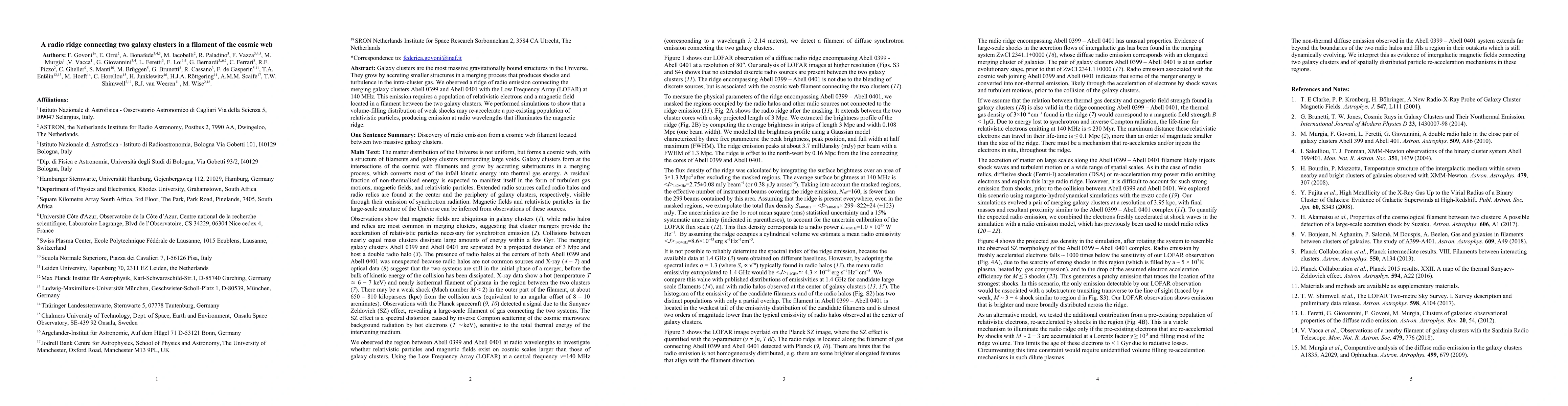 Galaxy clusters are the most massive gravitationally bound structures in the Universe. They grow by accreting smaller structures in a merging process that produces shocks and turbulence in the intra-cluster gas. We observed a ridge of radio emission connecting the merging galaxy clusters Abell 0399 and Abell 0401 with the Low Frequency Array (LOFAR) at 140 MHz. This emission requires a population of relativistic electrons and a magnetic field located in a filament between the two galaxy clusters. We performed simulations to show that a volume-filling distribution of weak shocks may re-accelerate a pre-existing population of relativistic particles, producing emission at radio wavelengths that illuminates the magnetic ridge.