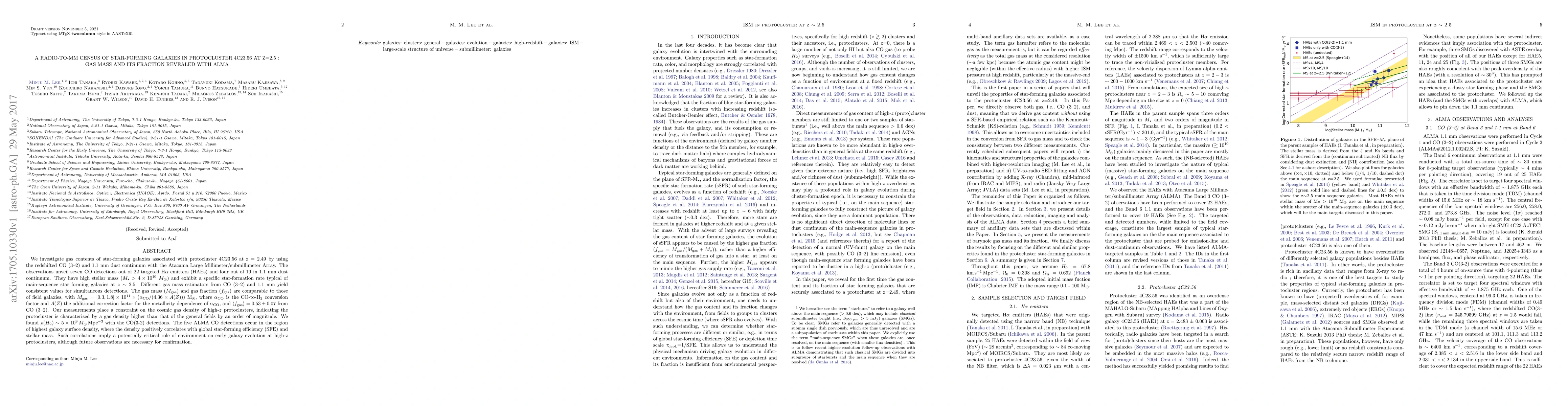 We investigate gas contents of star-forming galaxies associated with protocluster 4C23.56 at z = 2.49 by using the redshifted CO(3-2) and 1.1 mm dust continuum with the Atacama Large Millimeter/submillimeter Array. The observations unveil seven CO detections out of 22 targeted H$\alpha$ emitters (HAEs) and four out of 19 in 1.1 mm dust continuum. They have high stellar mass ($M_{\star}>4\times 10^{10}$ $M_{\odot}$) and exhibit a specific star-formation rate typical of main-sequence star forming galaxies at $z\sim2.5$. Different gas mass estimators from CO(3-2) and 1.1 mm yield consistent values for simultaneous detections. The gas mass ($M_{\rm gas}$) and gas fraction ($f_{\rm gas}$) are comparable to those of field galaxies, with $M_{\rm gas}=[0.3, 1.8]\times10^{11} \times (\alpha_{\rm CO}/(4.36\times A(Z)$)) M$_{\odot}$, where $\alpha_{\rm CO}$ is the CO-to-H$_2$ conversion factor and $A(Z)$ the additional correction factor for the metallicity dependence of $\alpha_{\rm CO}$, and $\langle f_{\rm gas}\rangle = 0.53 \pm 0.07$ from CO(3-2). Our measurements place a constraint on the cosmic gas density of high-$z$ protoclusters, indicating the protocluster is characterized by a gas density higher than that of the general fields by an order of magnitude. We found $\rho (H_2)\sim 5 \times 10^9 \,M_{\odot}\,{\rm Mpc^{-3}}$ with the CO(3-2) detections. The five ALMA CO detections occur in the region of highest galaxy surface density, where the density positively correlates with global star-forming efficiency (SFE) and stellar mass. Such correlations imply a potentially critical role of environment on early galaxy evolution at high-z protoclusters, although future observations are necessary for confirmation.