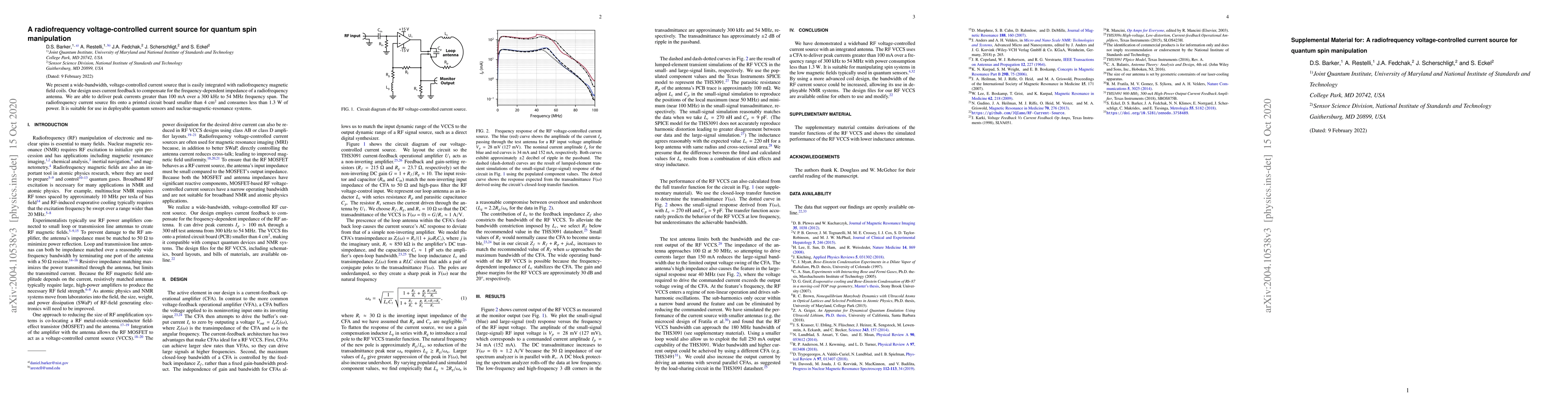 We present a design for a wide-bandwidth, voltage-controlled current source that is easily integrated with radiofrequency magnetic field coils. Our design uses current feedback to compensate for the frequency-dependent impedance of a radiofrequency antenna. We are able to deliver peak currents greater than 100 mA over a 300 kHz to 54 MHz frequency span. The radiofrequency current source fits onto a printed circuit board smaller than $4~\text{cm}^2$ and consumes less than 1.3 W of power. It is suitable for use in deployable quantum sensors and nuclear-magnetic-resonance systems.