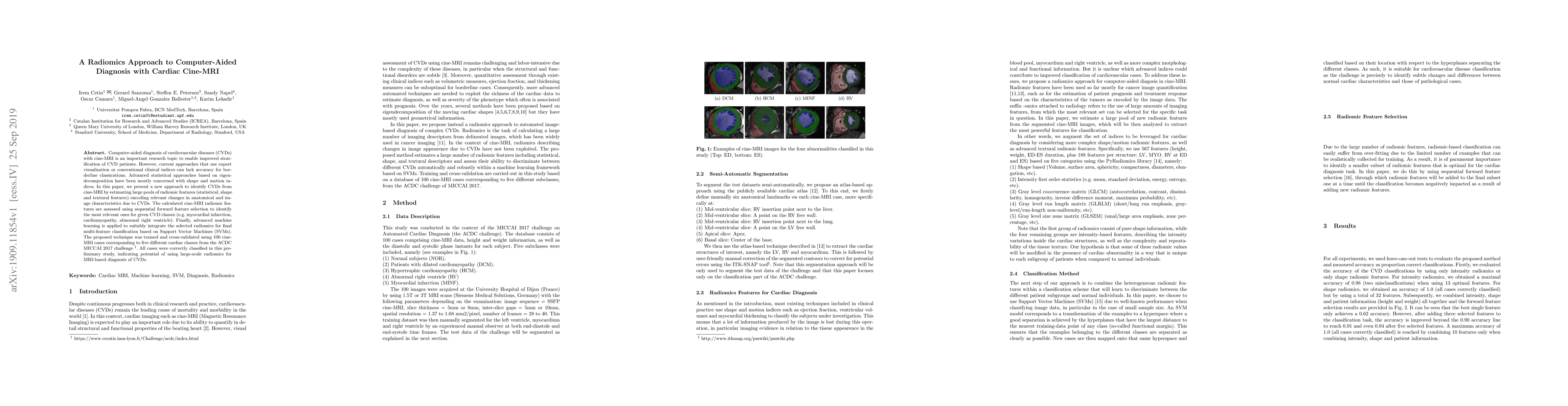 Use expert visualization or conventional clinical indices can lack accuracy for borderline classications. Advanced statistical approaches based on eigen-decomposition have been mostly concerned with shape and motion indices. In this paper, we present a new approach to identify CVDs from cine-MRI by estimating large pools of radiomic features (statistical, shape and textural features) encoding relevant changes in anatomical and image characteristics due to CVDs. The calculated cine-MRI radiomic features are assessed using sequential forward feature selection to identify the most relevant ones for given CVD classes (e.g. myocardial infarction, cardiomyopathy, abnormal right ventricle). Finally, advanced machine learning is applied to suitably integrate the selected radiomics for final multi-feature classification based on Support Vector Machines (SVMs). The proposed technique was trained and cross-validated using 100 cine-MRI cases corresponding to five different cardiac classes from the ACDC MICCAI 2017 challenge \footnote{https://www.creatis.insa-lyon.fr/Challenge/acdc/index.html}. All cases were correctly classified in this preliminary study, indicating potential of using large-scale radiomics for MRI-based diagnosis of CVDs.