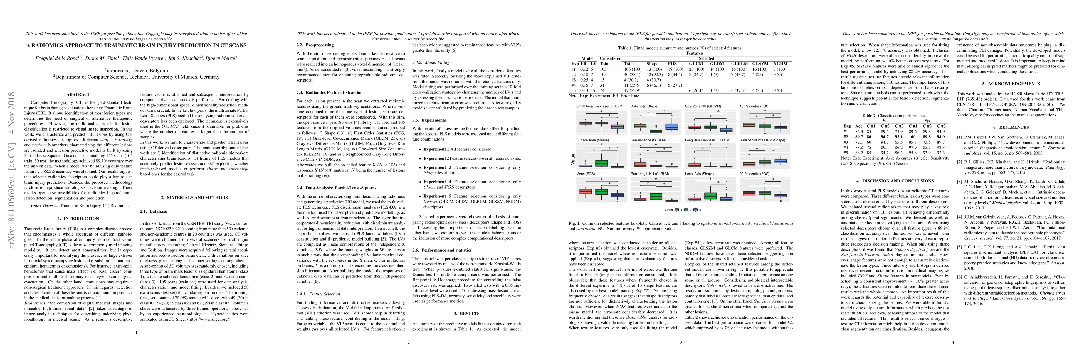 This paper proposes a radiomics approach using CT scans to predict traumatic brain injury (TBI) lesions, achieving 89.7% accuracy with a combination of shape, intensity, and texture features. Texture-only features also yielded 88.2% accuracy, indicating radiomics descriptors' potential in aiding brain injury prediction and decision-making.