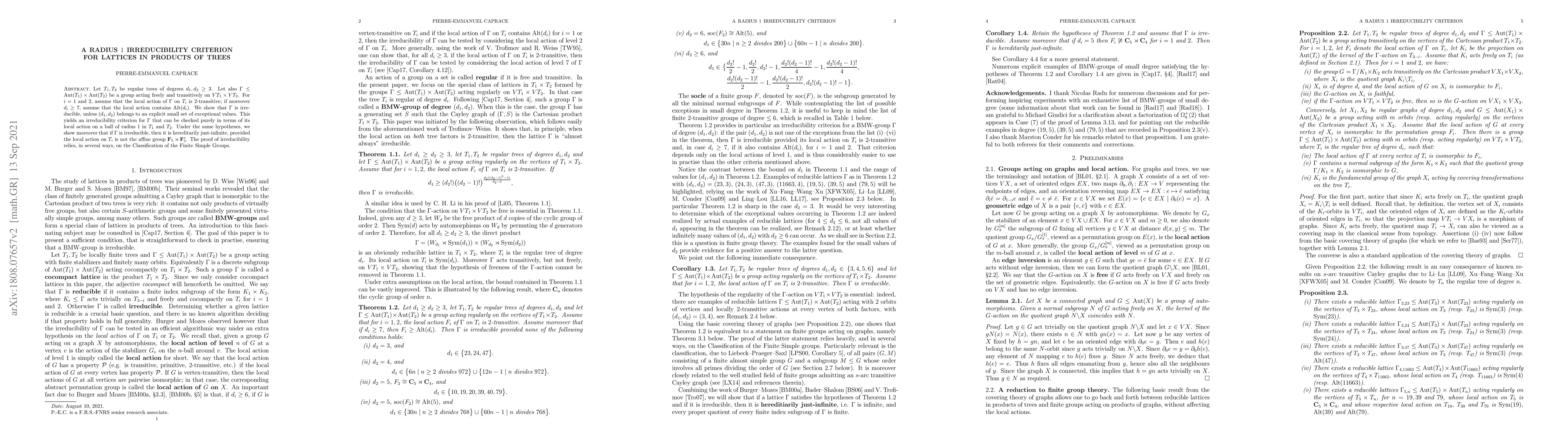 Let $T_1, T_2$ be regular trees of degrees $d_1, d_2 \geq 3$. Let also $\Gamma \leq \mathrm{Aut}(T_1) \times \mathrm{Aut}(T_2)$ be a group acting freely and transitively on $VT_1 \times VT_2$. For $i=1$ and $2$, assume that the local action of $\Gamma$ on $T_i$ is $2$-transitive; if moreover $d_i \geq 7$, assume that the local action contains $\mathrm{Alt}(d_i)$. We show that $\Gamma$ is irreducible, unless $(d_1, d_2)$ belongs to an explicit small set of exceptional values. This yields an irreducibility criterion for $\Gamma$ that can be checked purely in terms of its local action on a ball of radius~$1$ in $T_1$ and $T_2$. Under the same hypotheses, we show moreover that if $\Gamma$ is irreducible, then it is hereditarily just-infinite, provided the local action on $T_i$ is not the affine group $\mathbf F_5 \rtimes \mathbf F_5^*$. The proof of irreducibility relies, in several ways, on the Classification of the Finite Simple Groups.