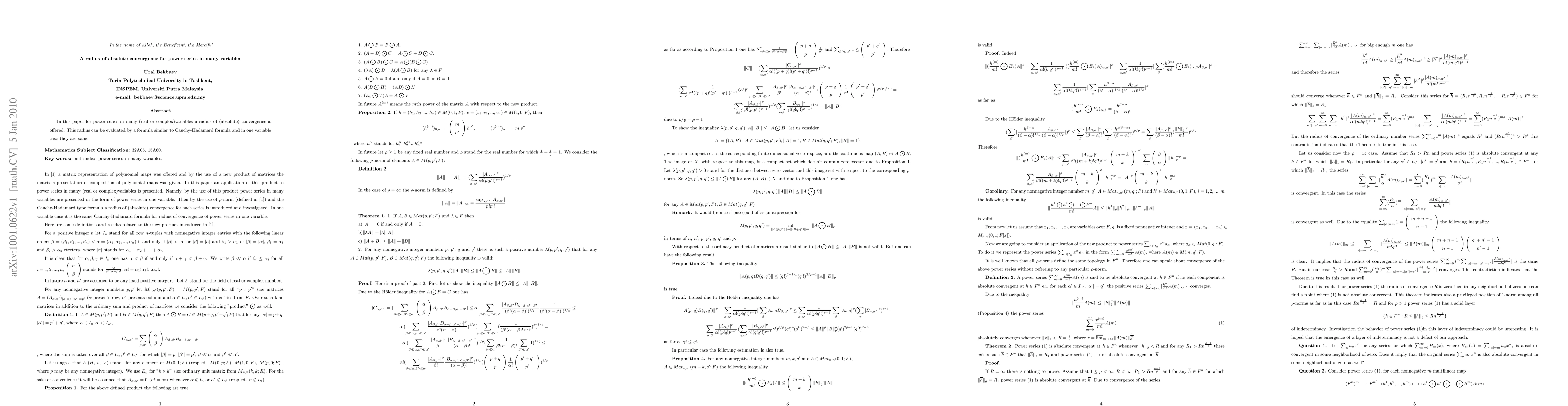 In this paper for power series in many (real or complex)variables a radius of (absolute) convergence is offered. This radius can be evaluated by a formula similar to Cauchy-Hadamard formula and in one variable case they are same.