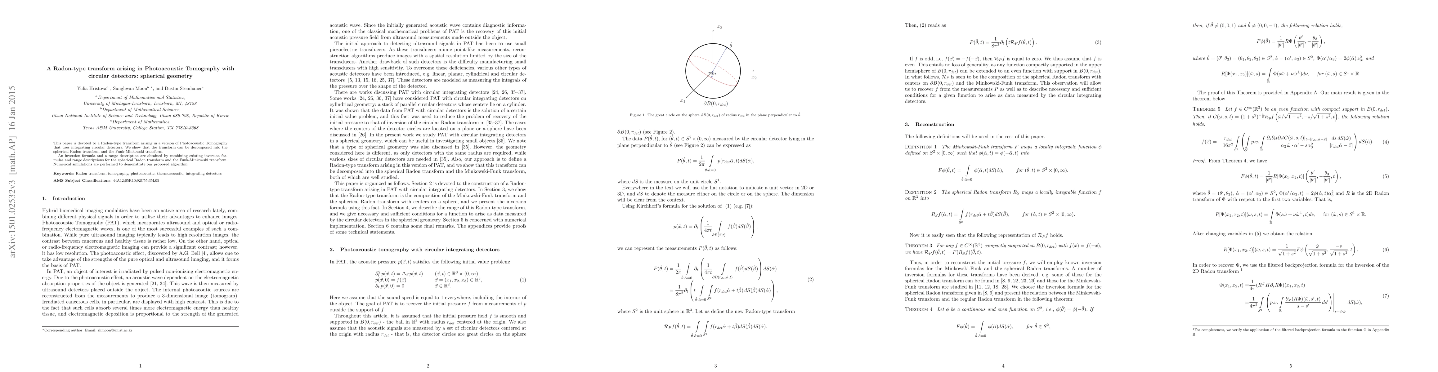 This paper investigates a Radon-type transform in Photoacoustic Tomography using circular detectors, decomposing it into the spherical Radon transform and the Funk-Minkowski transform. Numerical simulations validate the proposed algorithm for inversion and range description.