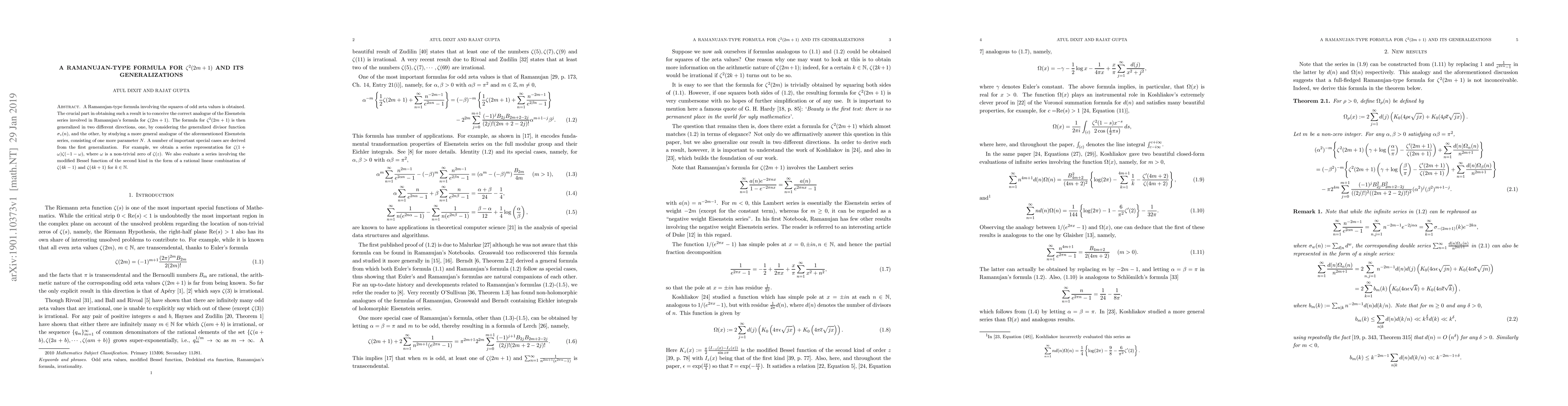 A Ramanujan-type formula involving the squares of odd zeta values is obtained. The crucial part in obtaining such a result is to conceive the correct analogue of the Eisenstein series involved in Ramanujan's formula for $\zeta(2m+1)$. The formula for $\zeta^{2}(2m+1)$ is then generalized in two different directions, one, by considering the generalized divisor function $\sigma_z(n)$, and the other, by studying a more general analogue of the aforementioned Eisenstein series, consisting of one more parameter $N$. A number of important special cases are derived from the first generalization. For example, we obtain a series representation for $\zeta(1+\omega)\zeta(-1-\omega)$, where $\omega$ is a non-trivial zero of $\zeta(z)$. We also evaluate a series involving the modified Bessel function of the second kind in the form of a rational linear combination of $\zeta(4k-1)$ and $\zeta(4k+1)$ for $k\in\mathbb{N}$.