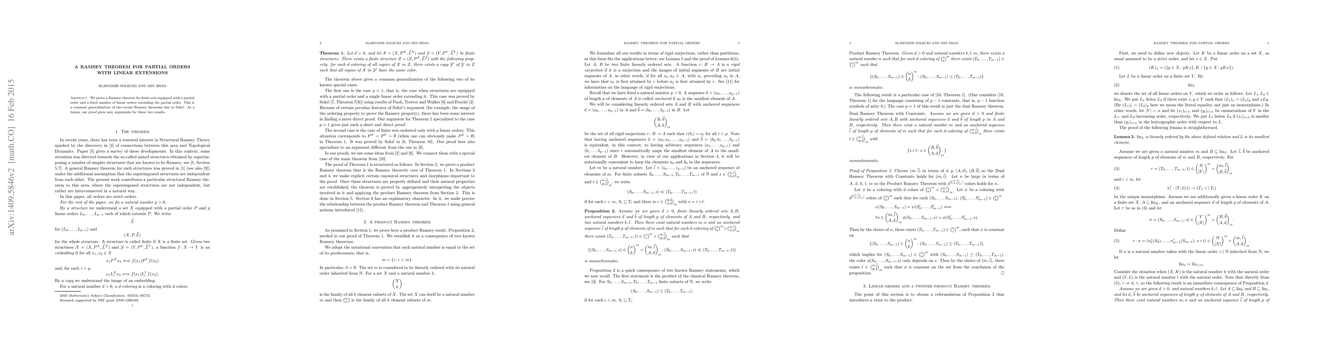 The paper proves a Ramsey theorem for finite sets equipped with a partial order and a fixed number of linear extensions, generalizing previous results by Sokić.