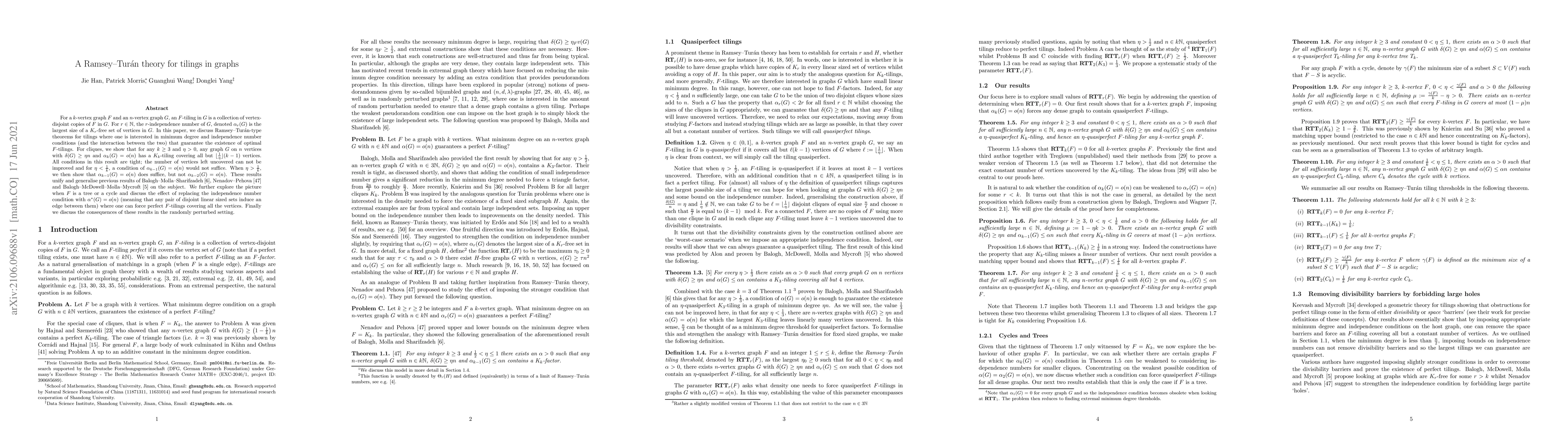 For a $k$-vertex graph $F$ and an $n$-vertex graph $G$, an $F$-tiling in $G$ is a collection of vertex-disjoint copies of $F$ in $G$. For $r\in \mathbb{N}$, the $r$-independence number of $G$, denoted $\alpha_r(G)$ is the largest size of a $K_r$-free set of vertices in $G$. In this paper, we discuss Ramsey--Tur\'an-type theorems for tilings where one is interested in minimum degree and independence number conditions (and the interaction between the two) that guarantee the existence of optimal $F$-tilings. For cliques, we show that for any $k\geq 3$ and $\eta>0$, any graph $G$ on $n$ vertices with $\delta(G)\geq \eta n$ and $\alpha_k(G)=o(n)$ has a $K_k$-tiling covering all but $\lfloor\tfrac{1}{\eta}\rfloor(k-1)$ vertices. All conditions in this result are tight; the number of vertices left uncovered can not be improved and for $\eta<\tfrac{1}{k}$, a condition of $\alpha_{k-1}(G)=o(n)$ would not suffice. When $\eta>\tfrac{1}{k}$, we then show that $\alpha_{k-1}(G)=o(n)$ does suffice, but not $\alpha_{k-2}(G)=o(n)$. These results unify and generalise previous results of Balogh-Molla-Sharifzadeh, Nenadov-Pehova and Balogh-McDowell-Molla-Mycroft on the subject. We further explore the picture when $F$ is a tree or a cycle and discuss the effect of replacing the independence number condition with $\alpha^*(G)=o(n)$ (meaning that any pair of disjoint linear sized sets induce an edge between them) where one can force perfect $F$-tilings covering all the vertices. Finally we discuss the consequences of these results in the randomly perturbed setting.