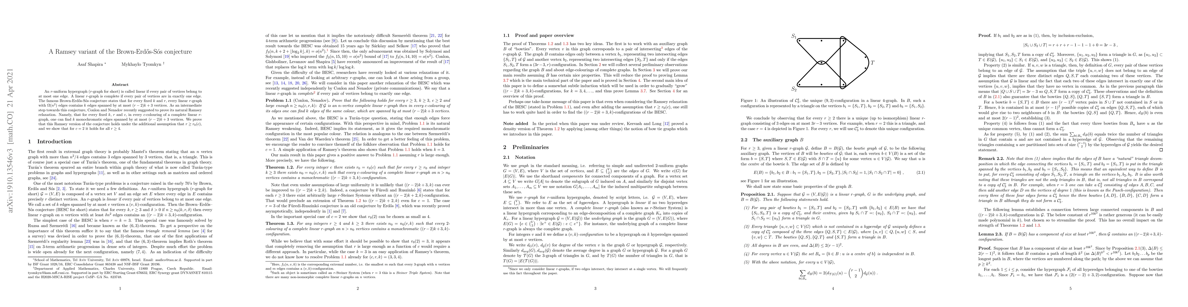 An $r$-uniform hypergraph ($r$-graph for short) is called linear if every pair of vertices belong to at most one edge. A linear $r$-graph is complete if every pair of vertices are in exactly one edge. The famous Brown-Erd\H{o}s-S\'os conjecture states that for every fixed $k$ and $r$, every linear $r$-graph with $\Omega(n^2)$ edges contains $k$ edges spanned by at most $(r-2)k+3$ vertices. As an intermediate step towards this conjecture, Conlon and Nenadov recently suggested to prove its natural Ramsey relaxation. Namely, that for every fixed $k$, $r$ and $c$, in every $c$-colouring of a complete linear $r$-graph, one can find $k$ monochromatic edges spanned by at most $(r-2)k+3$ vertices. We prove that this Ramsey version of the conjecture holds under the additional assumption that $r \geq r_0(c)$, and we show that for $c=2$ it holds for all $r\geq 4$.