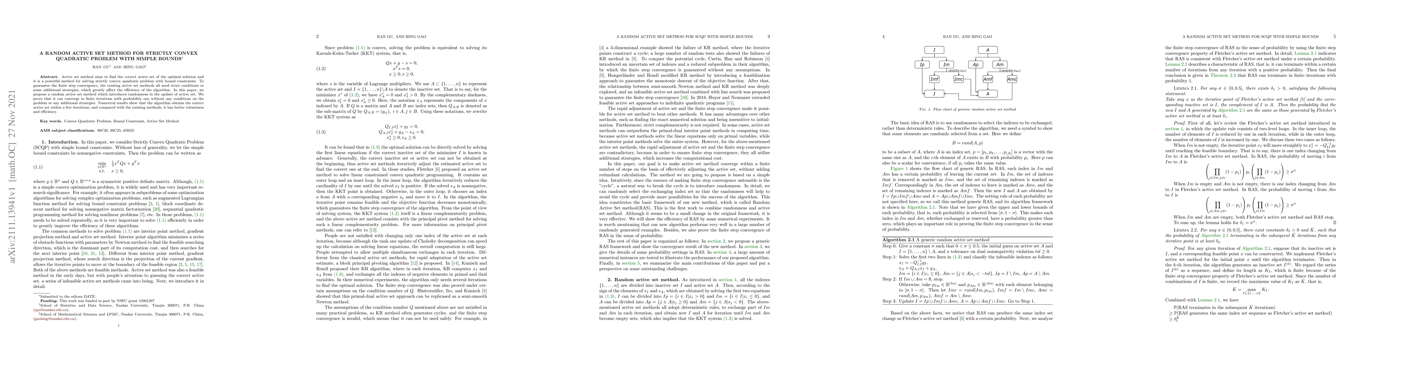 Active set method aims to find the correct active set of the optimal solution and it is a powerful method for solving strictly convex quadratic problem with bound constraints. To guarantee the finite step convergence, the existing active set methods all need strict conditions or some additional strategies, which greatly affect the efficiency of the algorithm. In this paper, we propose a random active set method which introduces randomness in the update of active set. We prove that it can converge in finite iterations with probability one without any conditions on the problem or any additional strategies. Numerical results show that the algorithm obtains the correct active set within a few iterations, and compared with the existing methods, it has better robustness and efficiency.