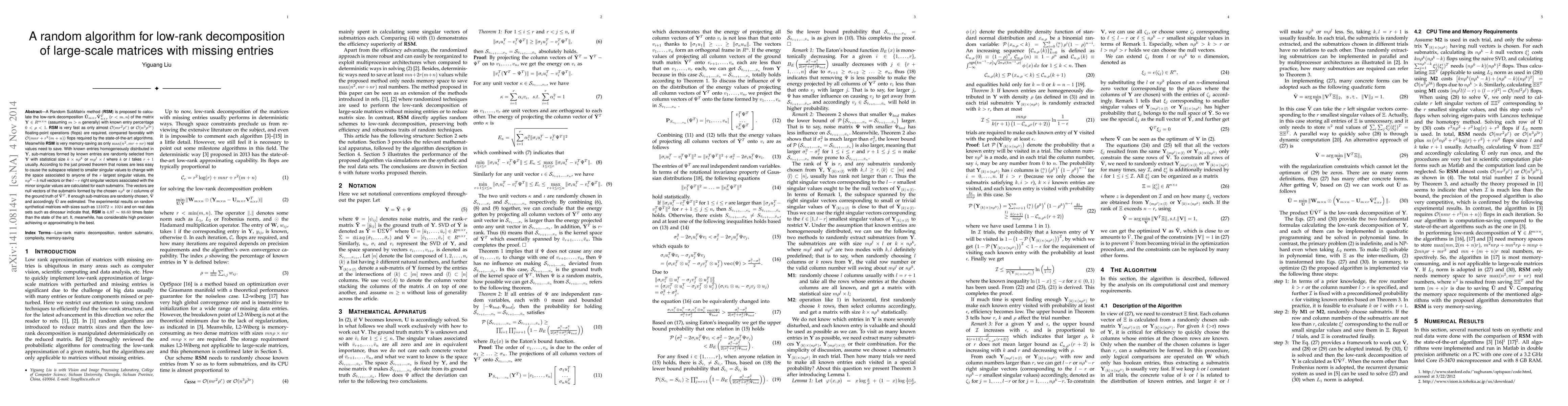 The paper proposes a Random SubMatrix method (RSM) for fast and memory-efficient low-rank decomposition of large-scale matrices with missing entries. RSM selects random submatrices of known entries to calculate null vectors associated with minor singular values, achieving high precision and outperforming state-of-the-art algorithms in speed and memory usage.