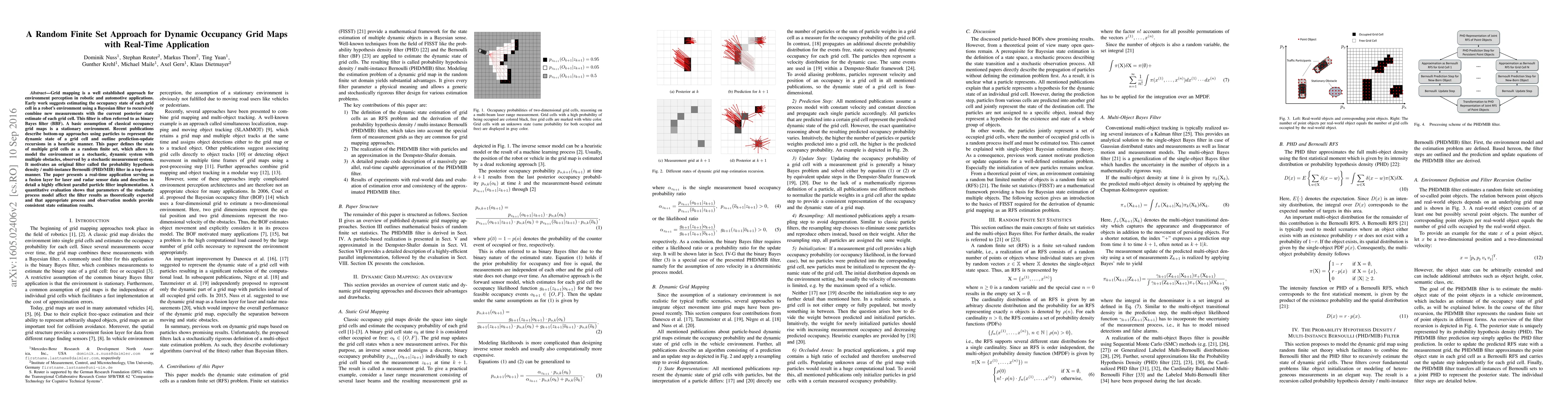 This paper proposes a random finite set approach for dynamic occupancy grid maps, introducing the PHD/MIB filter to model and predict the dynamic state of grid cells in a non-stationary environment. The method is demonstrated through a real-time application fusing laser and radar sensor data, showing effective parallel implementation and consistent state estimation.