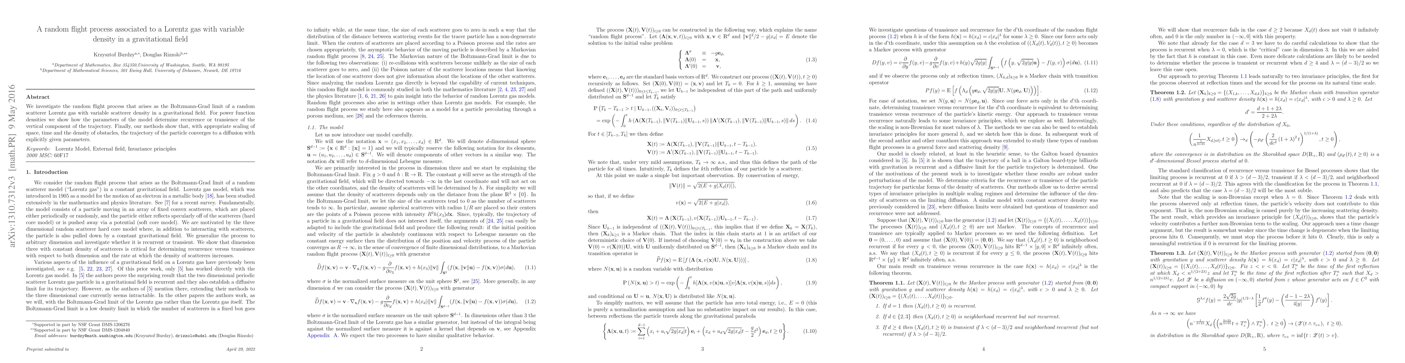 This paper studies the random flight process in a gravitational field for a Lorentz gas with variable scatterer density, demonstrating the recurrence or transience of the vertical trajectory component based on model parameters. The analysis shows that, under proper scaling, the particle's trajectory converges to a diffusion process with defined parameters.