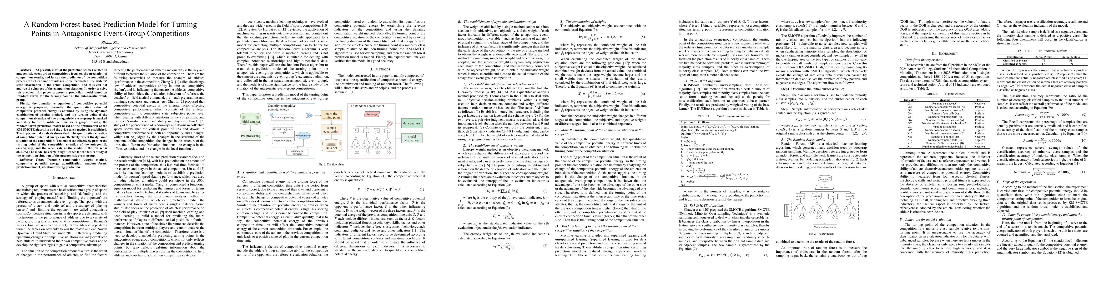 This paper proposes a Random Forest-based prediction model to identify turning points in antagonistic event-group competitions using a quantitative competitive potential energy equation and the KM-SMOTE optimization. The model achieves an 86.13% recall rate, offering valuable real-time insights into competition dynamics.