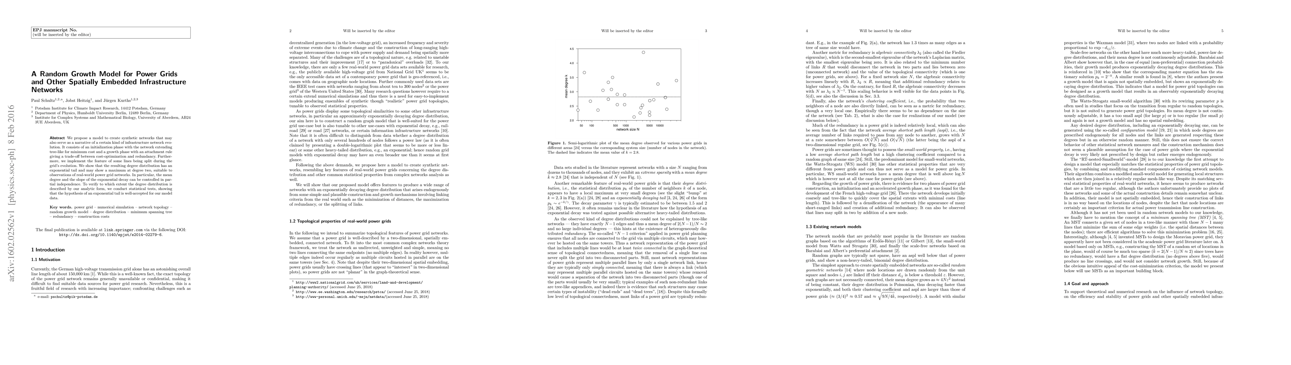 We propose a model to create synthetic networks that may also serve as a narrative of a certain kind of infrastructure network evolution. It consists of an initialization phase with the network extending tree-like for minimum cost and a growth phase with an attachment rule giving a trade-off between cost-optimization and redundancy. Furthermore, we implement the feature of some lines being split during the grid's evolution. We show that the resulting degree distribution has an exponential tail and may show a maximum at degree two, suitable to observations of real-world power grid networks. In particular, the mean degree and the slope of the exponential decay can be controlled in partial independence. To verify to which extent the degree distribution is described by our analytic form, we conduct statistical tests, showing that the hypothesis of an exponential tail is well-accepted for our model data.