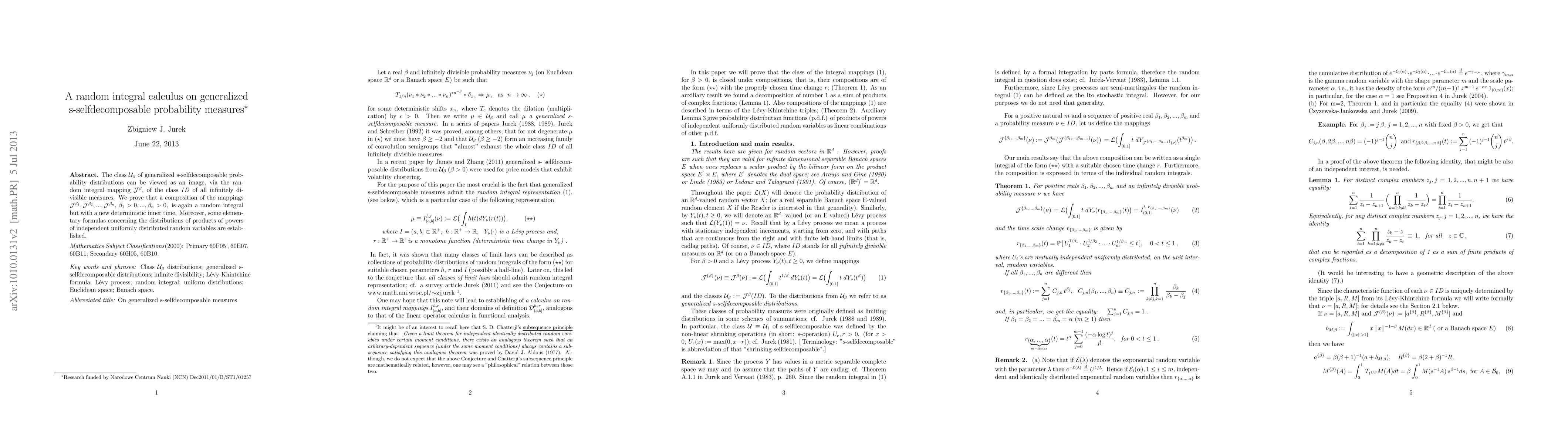It is known that the class $\mathcal{U}_{\beta}$, of generalized s-selfdecom-posable probability distributions, can be viewed as an image via random integral mapping $\mathcal{J}^{\beta}$ of the class $ID$ of all infinitely divisible measures. We prove that a composition of the mappings $\mathcal{J}^{\beta_1}, \mathcal{J}^{\beta_2}, ..., \mathcal{J}^{\beta_n}$ is again random integral mapping but with a new inner time. In a proof some form of Lagrange interpolation formula is needed. Moreover, some elementary formulas concerning the distributions of products of powers of independent uniformly distributed random variables as established as well.