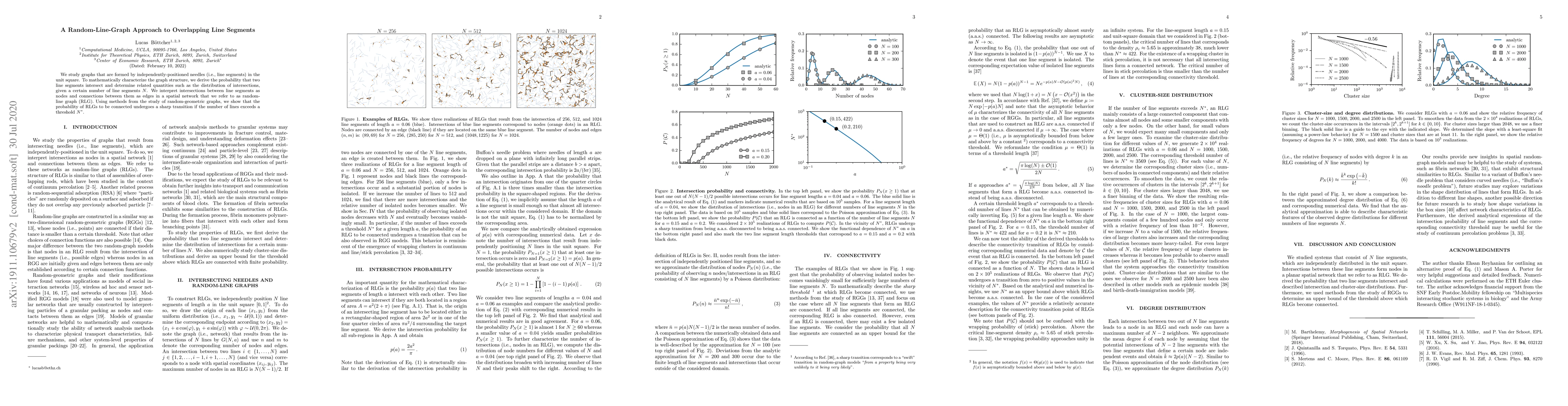 This paper studies graphs formed by randomly positioned line segments in a unit square, finding that a certain threshold of lines causes the graph to become connected with a sharp transition.
