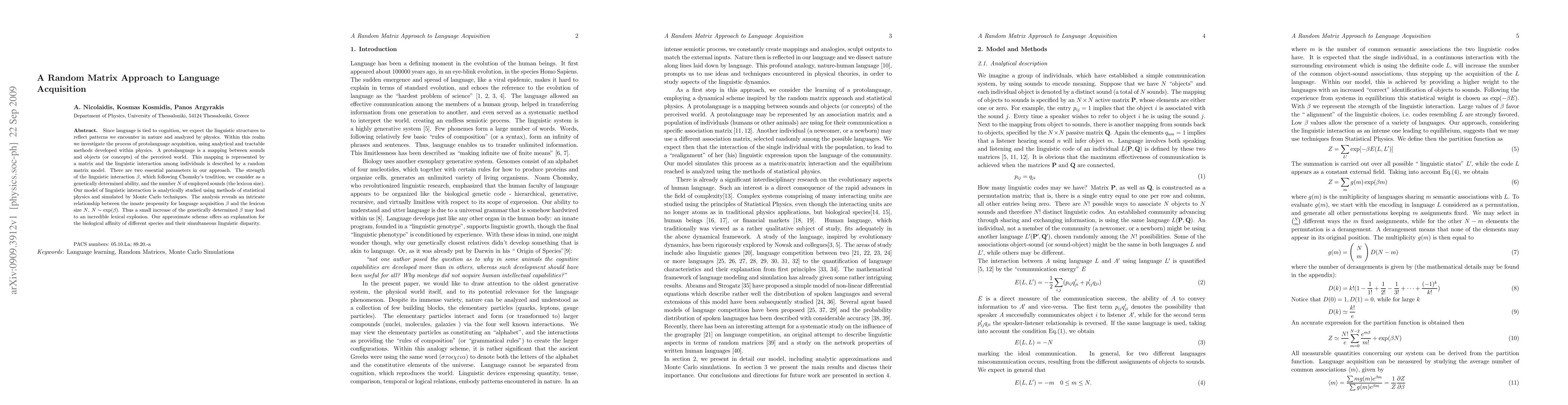 Since language is tied to cognition, we expect the linguistic structures to reflect patterns we encounter in nature and analyzed by physics. Within this realm we investigate the process of protolanguage acquisition, using analytical and tractable methods developed within physics. A protolanguage is a mapping between sounds and objects (or concepts) of the perceived world. This mapping is represented by a matrix and the linguistic interaction among individuals is described by a random matrix model. There are two essential parameters in our approach. The strength of the linguistic interaction $\beta$, which following Chomsky's tradition, we consider as a genetically determined ability, and the number $N$ of employed sounds (the lexicon size). Our model of linguistic interaction is analytically studied using methods of statistical physics and simulated by Monte Carlo techniques. The analysis reveals an intricate relationship between the innate propensity for language acquisition $\beta$ and the lexicon size $N$, $N \sim \exp(\beta)$. Thus a small increase of the genetically determined $\beta$ may lead to an incredible lexical explosion. Our approximate scheme offers an explanation for the biological affinity of different species and their simultaneous linguistic disparity.