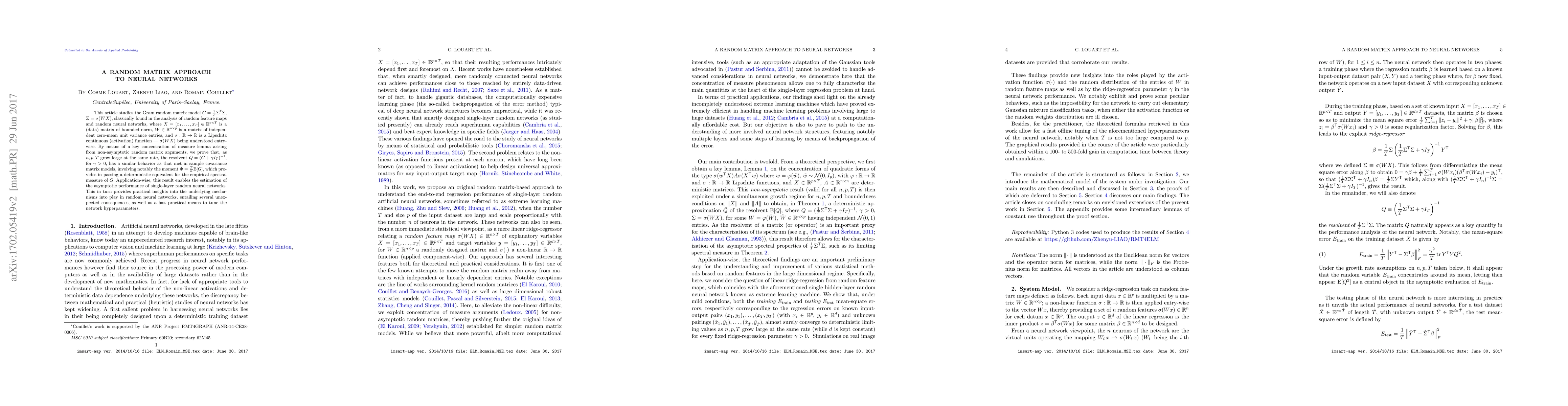 This paper employs a random matrix approach to analyze the Gram matrix in random neural networks, proving that the resolvent behaves similarly to sample covariance matrices. This provides insights into the asymptotic performance and practical tuning of single-layer random neural networks.