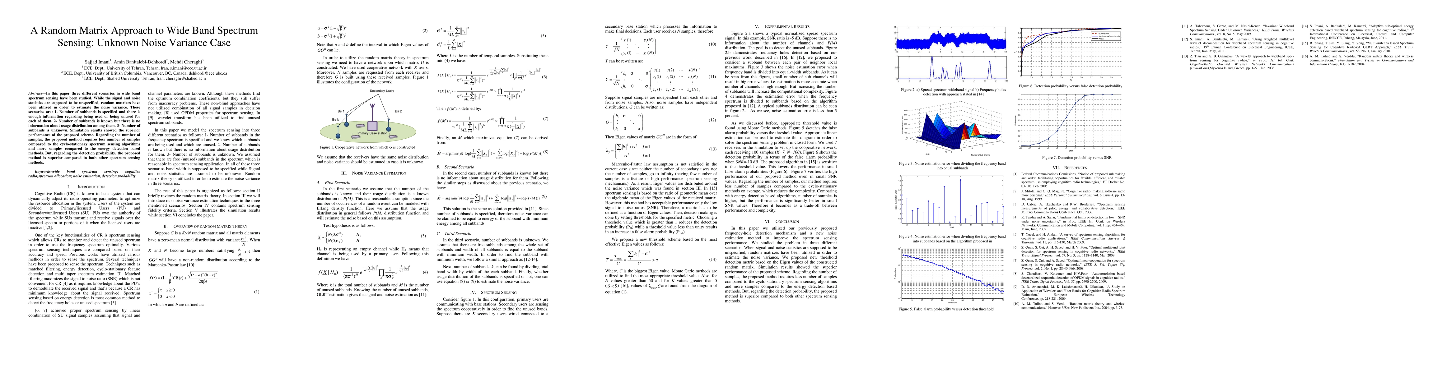 In this paper three different scenarios in wide band spectrum sensing have been studied. While the signal and noise statistics are supposed to be unspecified, random matrixes have been utilized in order to estimate the noise variance. These scenarios are: 1- Number of subbands is specified and there is enough information regarding being used or being unused for each of them. 2- Number of subbands is known but there is no information about usage distribution among them. 3- Number of subbands is unknown. Simulation results showed the superior performance of the proposed scheme. Regarding the number of samples, the proposed method requires less number of samples compared to the cyclo-stationary spectrum sensing algorithms and more samples compared to the energy detection based methods. But, regarding the detection probability, the proposed method is superior compared to both other spectrum sensing methods.