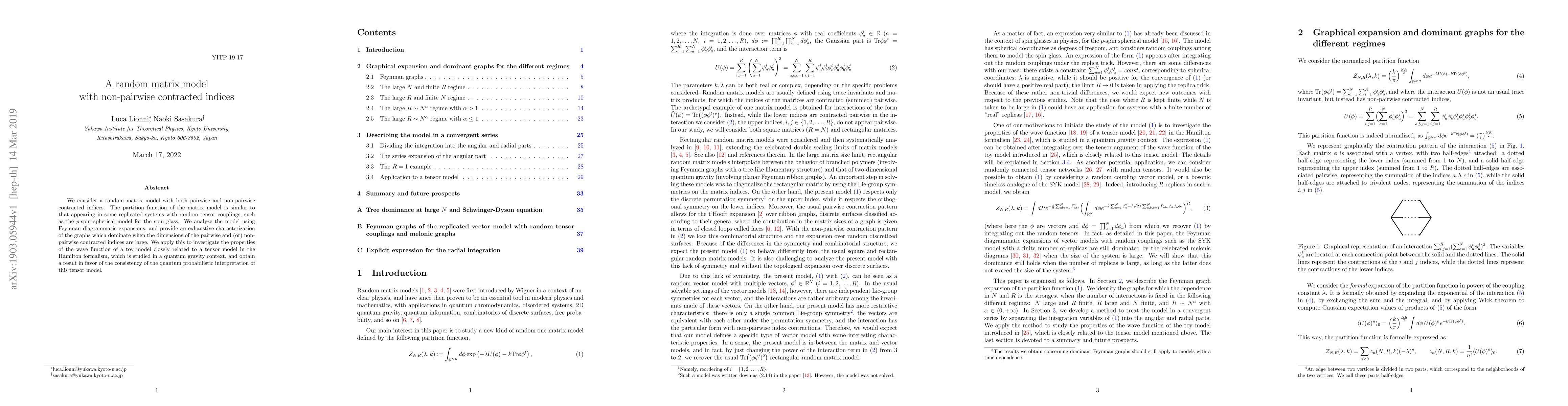 We consider a random matrix model with both pairwise and non-pairwise contracted indices. The partition function of the matrix model is similar to that appearing in some replicated systems with random tensor couplings, such as the p-spin spherical model for the spin glass. We analyze the model using Feynman diagrammatic expansions, and provide an exhaustive characterization of the graphs which dominate when the dimensions of the pairwise and (or) non-pairwise contracted indices are large. We apply this to investigate the properties of the wave function of a toy model closely related to a tensor model in the Hamilton formalism, which is studied in a quantum gravity context, and obtain a result in favor of the consistency of the quantum probabilistic interpretation of this tensor model.