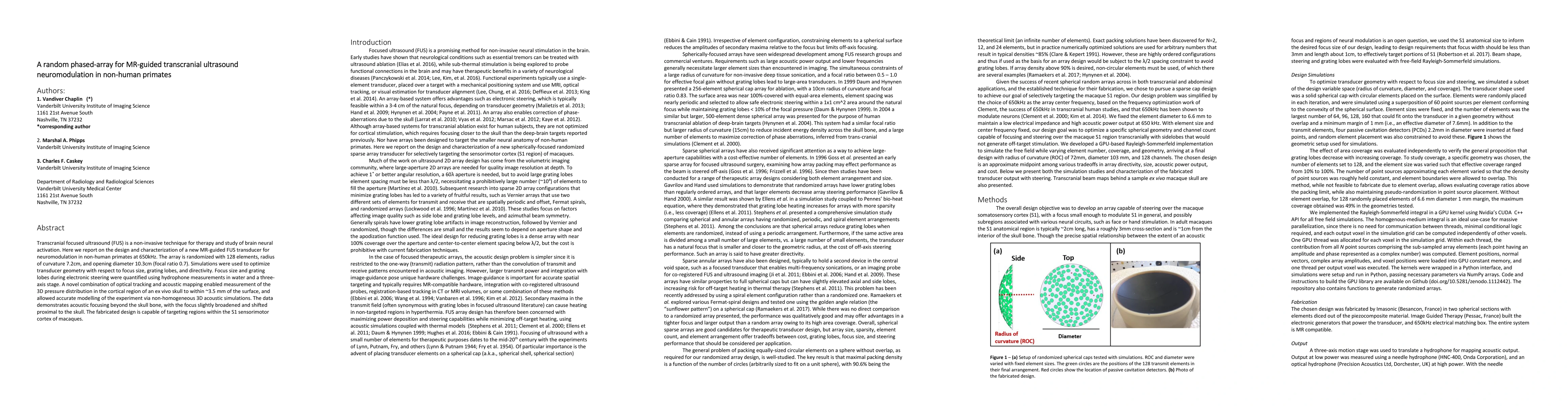 This paper details the design and testing of a randomized phased-array transducer for MR-guided transcranial focused ultrasound neuromodulation in non-human primates. The array's optimized geometry enables precise acoustic focusing through the skull, targeting the S1 sensorimotor cortex.