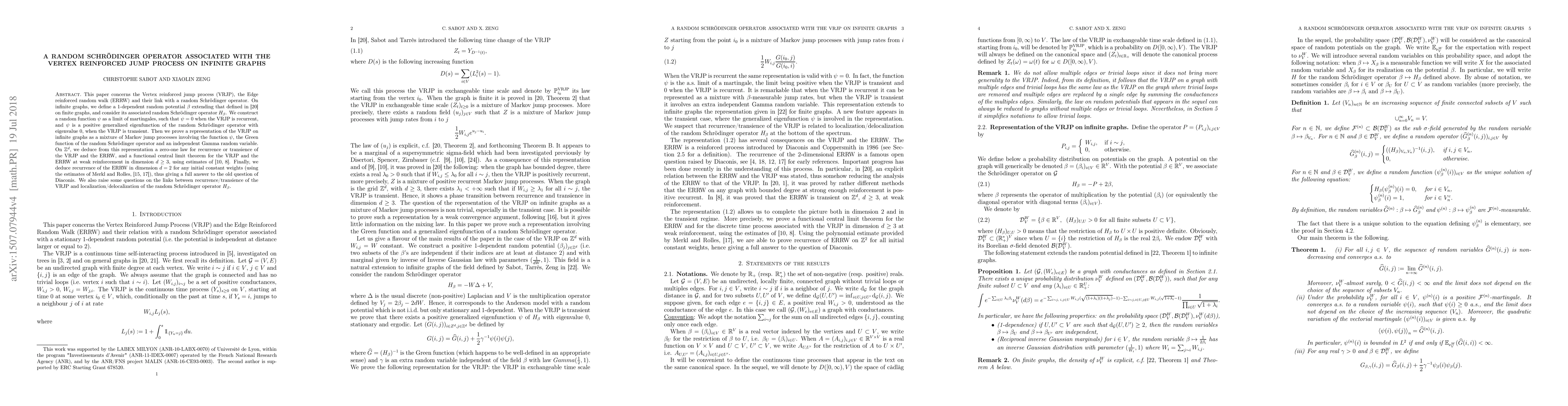 This paper studies the Vertex Reinforced Jump Process (VRJP) and its connection to a random Schrödinger operator on infinite graphs. It constructs a random function $\psi$ that characterizes the process's recurrence or transience, and proves a representation linking VRJP to Markov jump processes. The study concludes with a zero-one law for recurrence/transience and a functional central limit theorem, and confirms recurrence of the Edge reinforced random walk in dimension $d=2$.