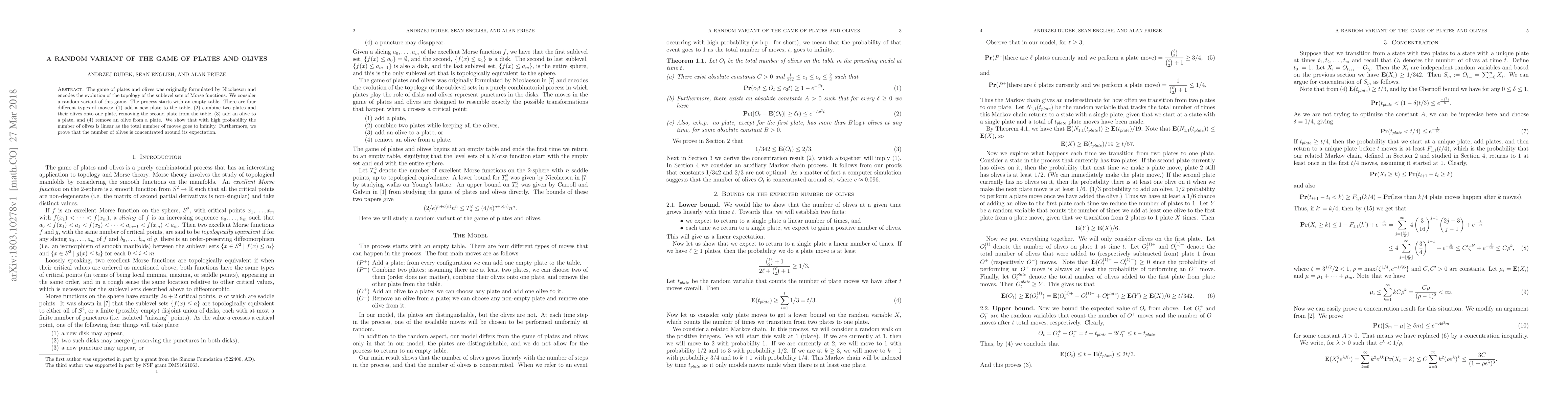 The game of plates and olives was originally formulated by Nicolaescu and encodes the evolution of the topology of the sublevel sets of Morse functions. We consider a random variant of this game. The process starts with an empty table. There are four different types of moves: (1) add a new plate to the table, (2) combine two plates and their olives onto one plate, removing the second plate from the table, (3) add an olive to a plate, and (4) remove an olive from a plate. We show that with high probability the number of olives is linear as the total number of moves goes to infinity. Furthermore, we prove that the number of olives is concentrated around its expectation.