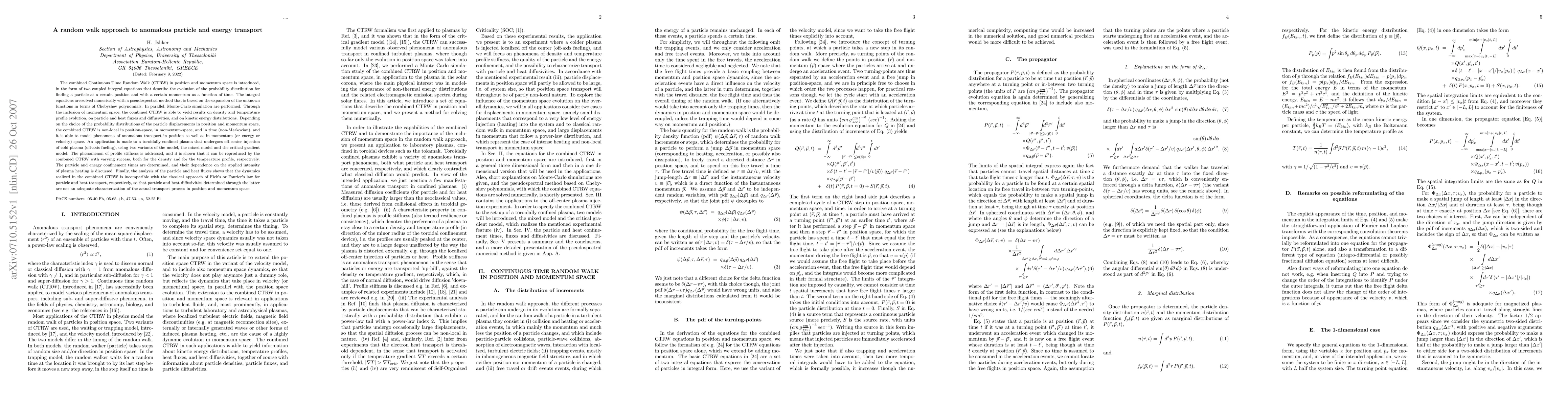 The combined Continuous Time Random Walk (CTRW) in position and momentum space is introduced, in the form of two coupled integral equations that describe the evolution of the probability distribution for finding a particle at a certain position and with a certain momentum as a function of time. The integral equations are solved numerically with a pseudospectral method that is based on the expansion of the unknown functions in terms of Chebyshev polynomials. In parallel, Monte-Carlo simulation are performed. Through the inclusion of momentum space, the combined CTRW is able to yield results on density and temperature profile evolution, on particle and heat fluxes and diffusivities, and on kinetic energy distributions. Depending on the choice of the probability distributions of the particle displacements in position and momentum space, the combined CTRW is able to model phenomena of anomalous transport in position as well as in momentum (or energy or velocity) space. An application is made to a toroidally confined plasma that undergoes off-center injection of cold plasma (off-axis fueling), using two variants of the model, the mixed model and the critical gradient model. The phenomenon of profile stiffness is addressed, both for the density and for the temperature profile, respectively, and the particle and energy confinement times are determined. The analysis of the particle and heat fluxes shows that the dynamics realized in the combined CTRW is incompatible with the classical approach of Fick's or Fourier's law for particle and heat transport, respectively.