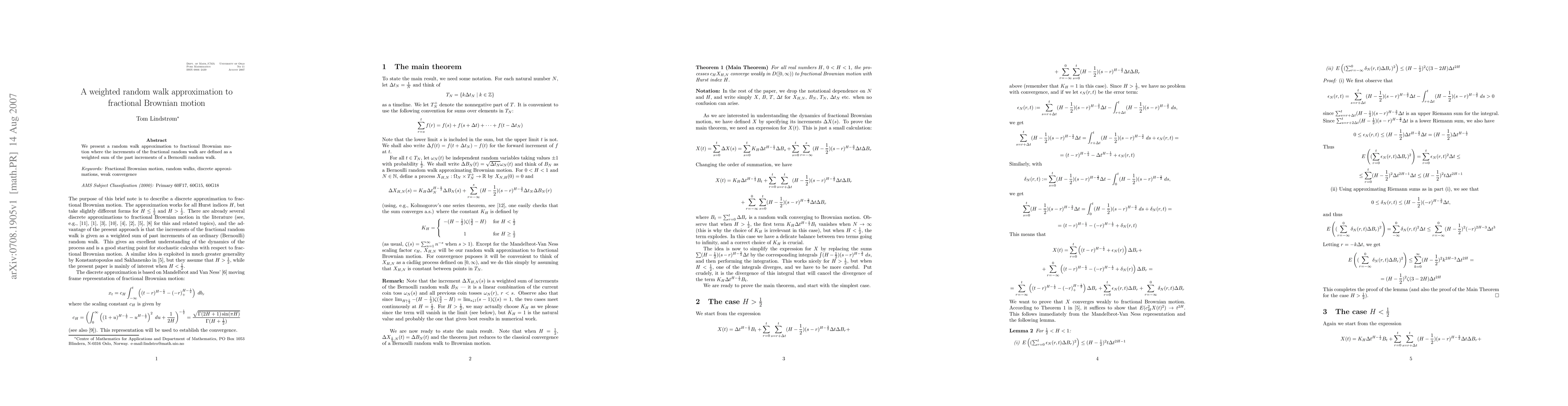 Summary: This paper proposes a random walk approximation for fractional Brownian motion, where the increments are modeled as a weighted sum of past increments from a Bernoulli random walk, providing a simpler representation of fractional Brownian motion.