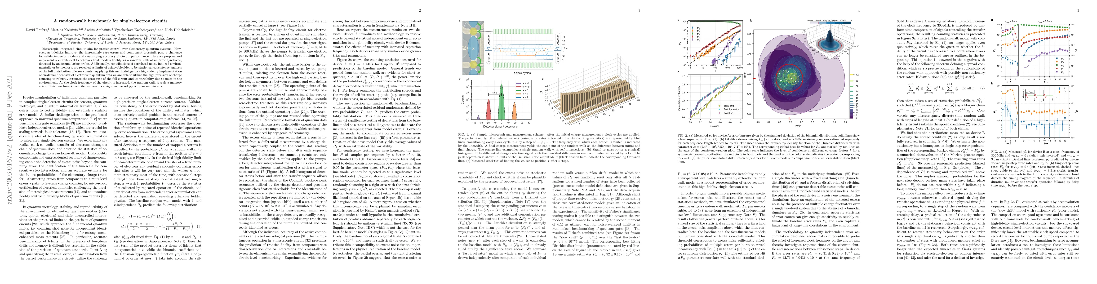 Mesoscopic integrated circuits achieving high-fidelity control of elementary quantum systems require new methodology for benchmarking. We offer circuit-level statistical description of rare-error accumulation in terms of a universal random-walk model for on-demand electron transfer. For a high-fidelity single-electron circuit, realized in the experiment as a chain of quantum dots in a GaAs/AlGaAs heterostructure, the error of the transfer operation is probed by charge counting. Error rates for extra ($P_+$) or missing ($P_-$) electrons of the electron shuttle are measured to $P_{-}=(6.92 \pm 0.14) \times 10^{-5}$ and $P_{+}=(2.13 \pm 0.08)\times 10^{-5}$ with uncertainty due to correlated noise in the environment. Furthermore, precise control over the timing of the random walk allows to explore the role of memory as the clock frequency is increased.