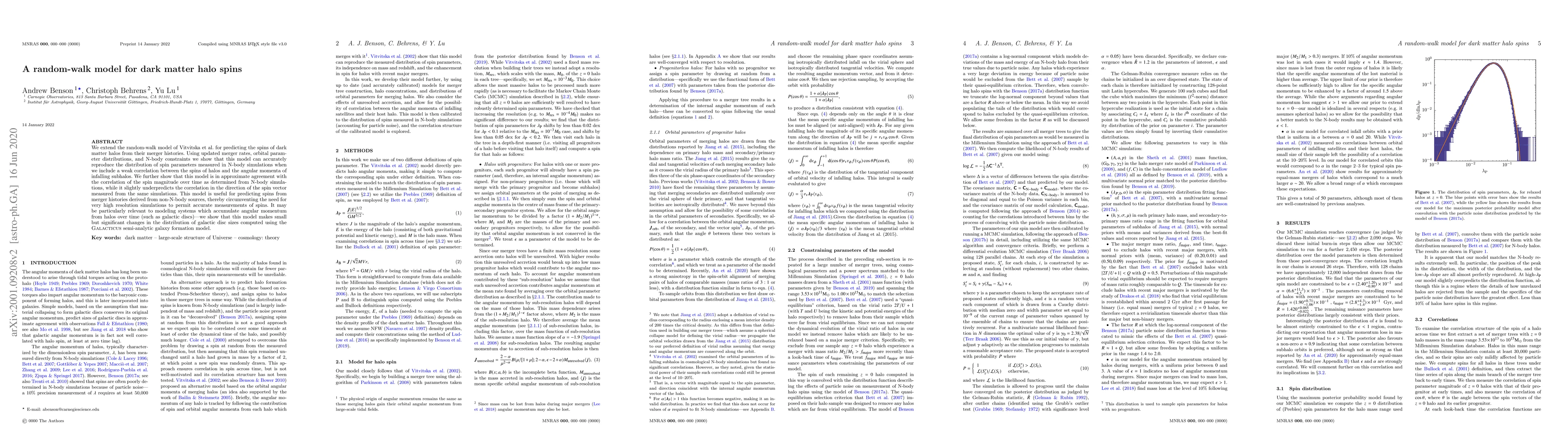 This paper proposes a random-walk model for predicting dark matter halo spins based on merger histories, showing good agreement with N-body simulations. The model slightly underpredicts spin vector correlations but is useful for systems like galactic discs, where it impacts computed disc sizes.