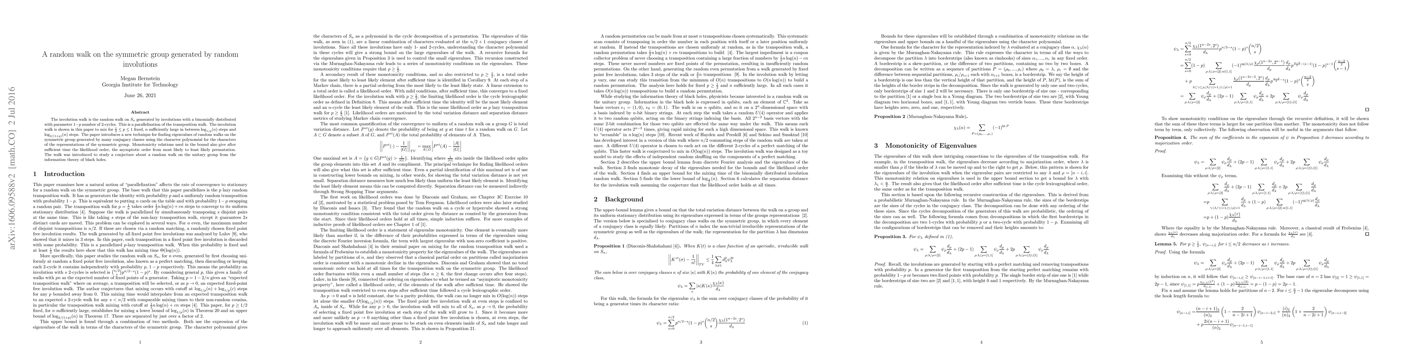 The involution walk is the random walk on $S_n$ generated by involutions with a binomially distributed with parameter $1-p$ number of $2$-cycles. This is a parallelization of the transposition walk. The involution walk is shown in this paper to mix for $\frac{1}{2} \leq p \leq 1$ fixed, $n$ sufficiently large in between $\log_{1/p}(n)$ steps and $\log_{2/(1+p)}(n)$ steps. The paper introduces a new technique for finding eigenvalues of random walks on the symmetric group generated by many conjugacy classes using the character polynomial for the characters of the representations of the symmetric group. Monotonicity relations used in the bound also give after sufficient time the likelihood order, the asymptotic order from most likely to least likely permutation. The walk was introduced to study a conjecture about a random walk on the unitary group from the information theory of black holes.